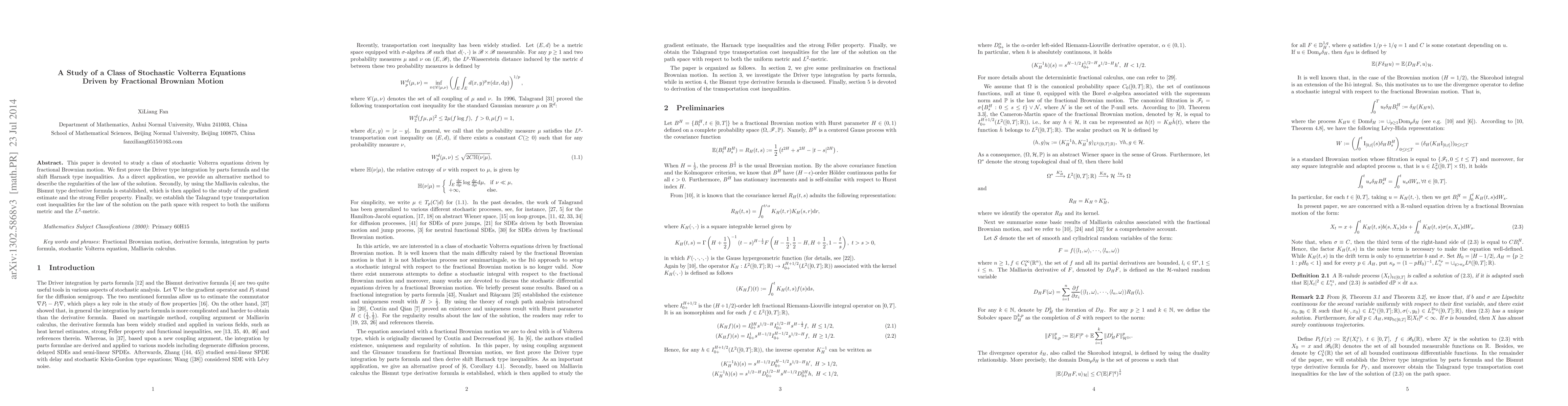 This paper is devoted to study a class of stochastic Volterra equations associated with fractional Brownian motion. We first prove the Driver type integration by parts formula and the shift Harnack type inequalities. As a direct application, we provide an alternative method to describe the regularities of the law of the solution. Secondly, by using the Malliavin calculus, the Bismut type derivative formula is established, which is then applied to the study of the gradient estimate and the strong Feller property. Finally, we establish the Talagrand type transportation cost inequalities for the law of the solution on the path space with respect to both the uniform metric and the $L^2$-metric.
