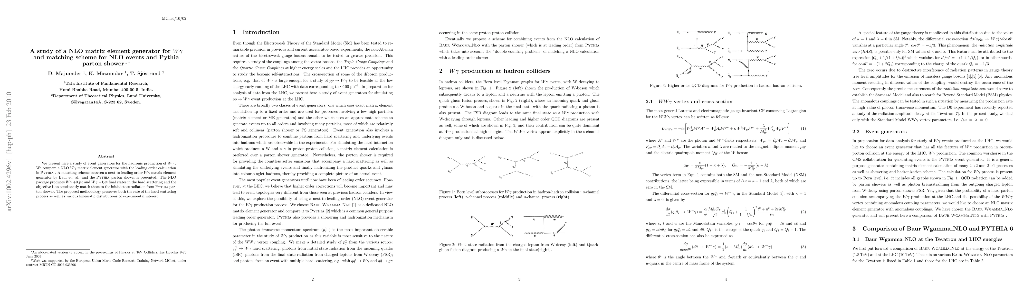We compare a NLO W gamma matrix element generator with the leading order calculation in Pythia . A matching scheme between a next-to-leading order W gamma matrix element generator by Baur et. al. and the Pythia parton shower is presented. The NLO package produces W gamma+0 jet and W gamma+1jet final states in the hard scattering and the objective is to consistently match these to the initial state radiation from Pythia parton shower. The proposed methodology preserves both the rate of the hard scattering process as well as various kinematic distributions of experimental interest.