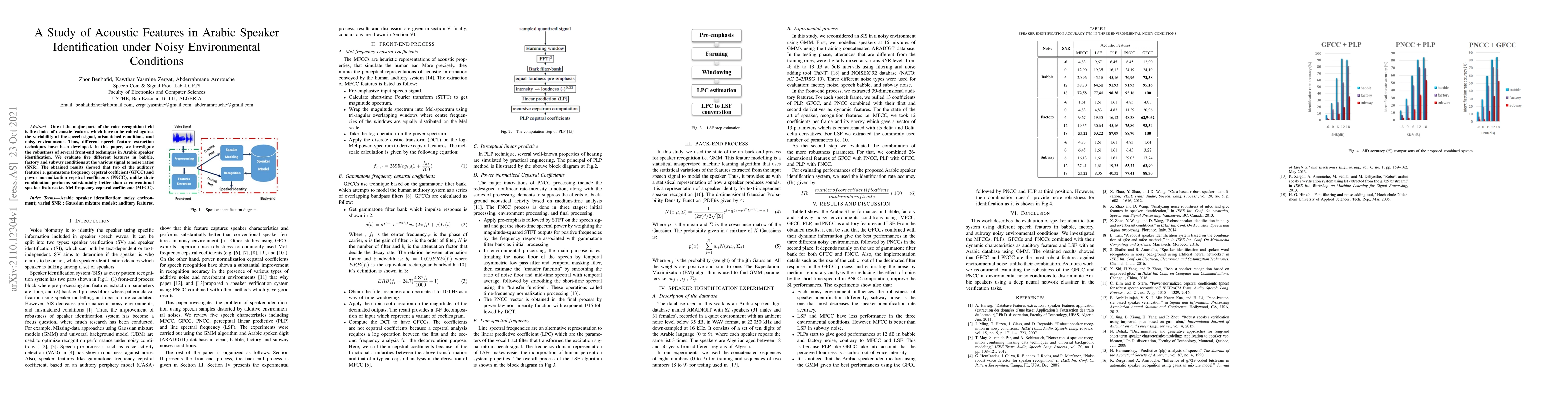 One of the major parts of the voice recognition field is the choice of acoustic features which have to be robust against the variability of the speech signal, mismatched conditions, and noisy environments. Thus, different speech feature extraction techniques have been developed. In this paper, we investigate the robustness of several front-end techniques in Arabic speaker identification. We evaluate five different features in babble, factory and subway conditions at the various signal to noise ratios (SNR). The obtained results showed that two of the auditory feature i.e. gammatone frequency cepstral coefficient (GFCC) and power normalization cepstral coefficients (PNCC), unlike their combination performs substantially better than a conventional speaker features i.e. Mel-frequency cepstral coefficients (MFCC).