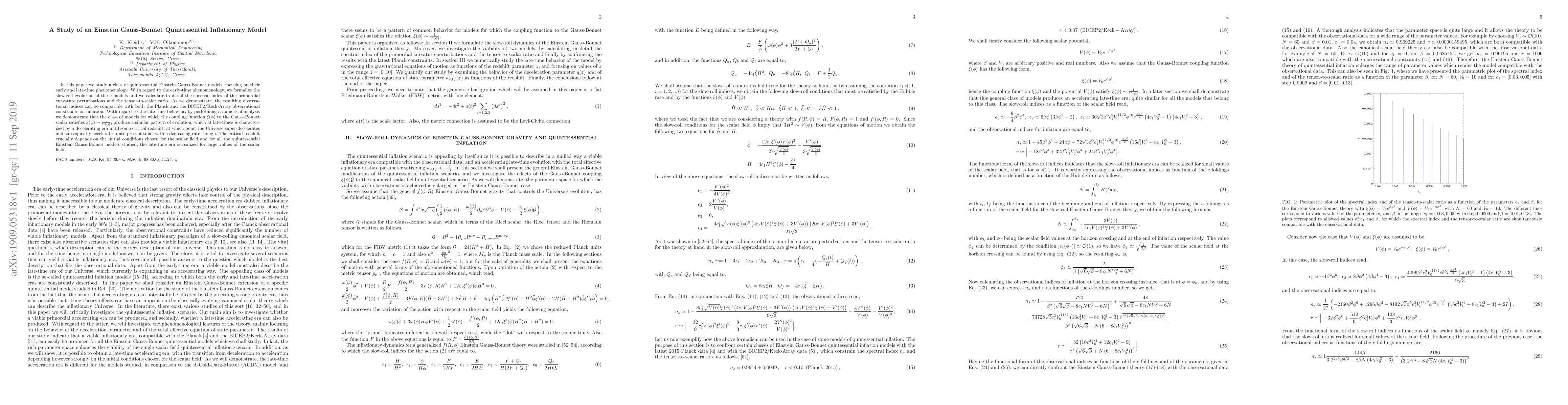 This study investigates a class of quintessential Einstein Gauss-Bonnet models, showing they can match observational constraints on inflation and exhibit characteristic late-time behavior including deceleration followed by acceleration.