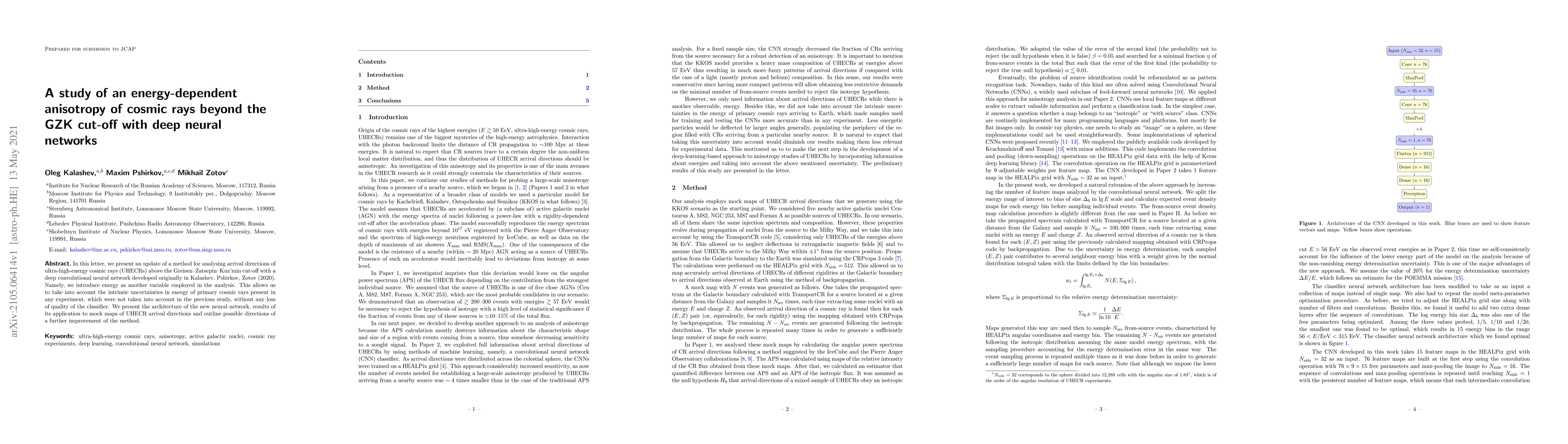 In this letter, we present an update of a method for analysing arrival directions of ultra-high-energy cosmic rays (UHECRs) above the Greisen--Zatsepin--Kuz'min cut-off with a deep convolutional neural network developed originally in Kalashev, Pshirkov, Zotov (2020). Namely, we introduce energy as another variable employed in the analysis. This allows us to take into account the intrinsic uncertainties in energy of primary cosmic rays present in any experiment, which were not taken into account in the previous study, without any loss of quality of the classifier. We present the architecture of the new neural network, results of its application to mock maps of UHECR arrival directions and outline possible directions of a further improvement of the method.
