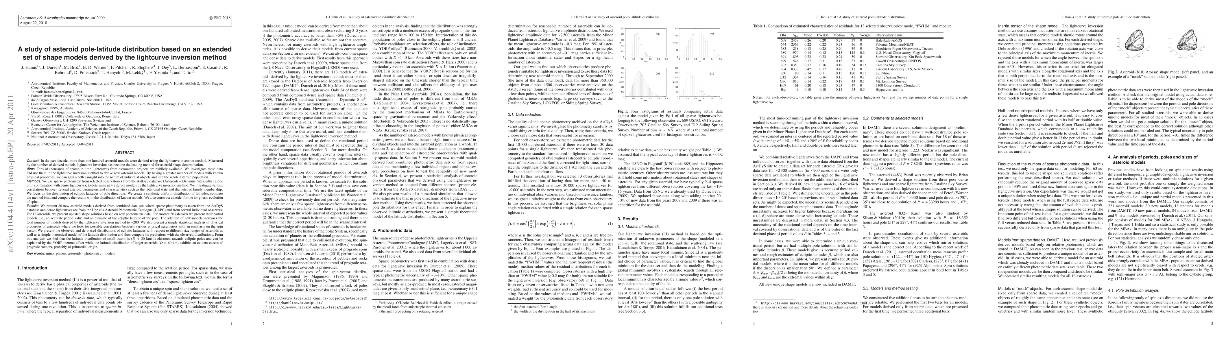 A study of asteroid pole-latitude distribution used lightcurve inversion method to derive new asteroid models from public data, revealing correlations between spin vector and size range.