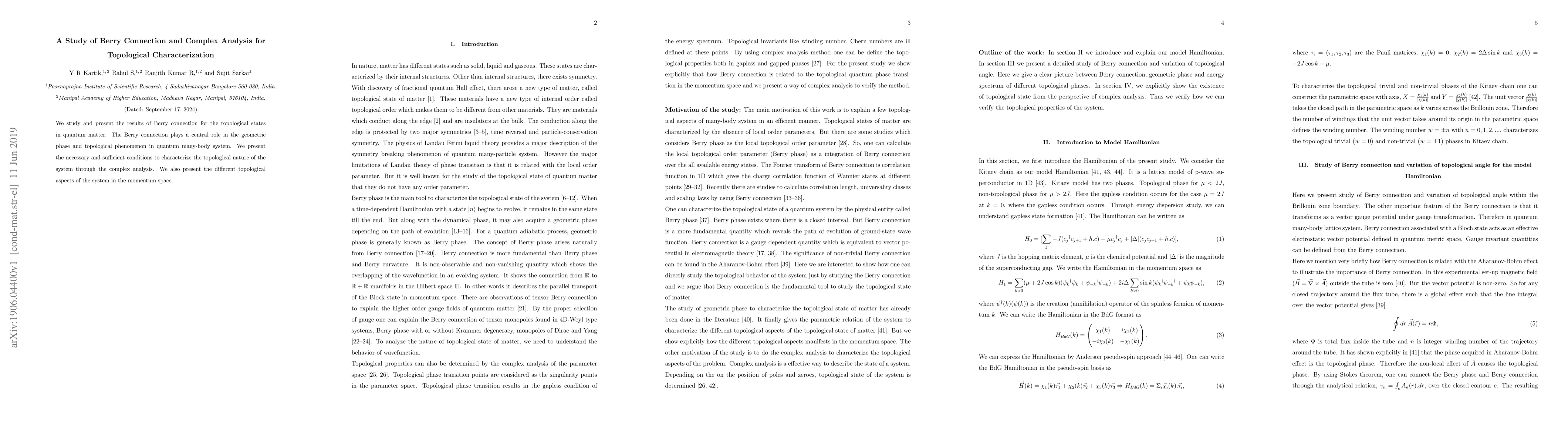 This study explores the role of Berry connection in identifying topological states within quantum matter, presenting conditions for topological characterization via complex analysis. It also examines topological aspects in momentum space.