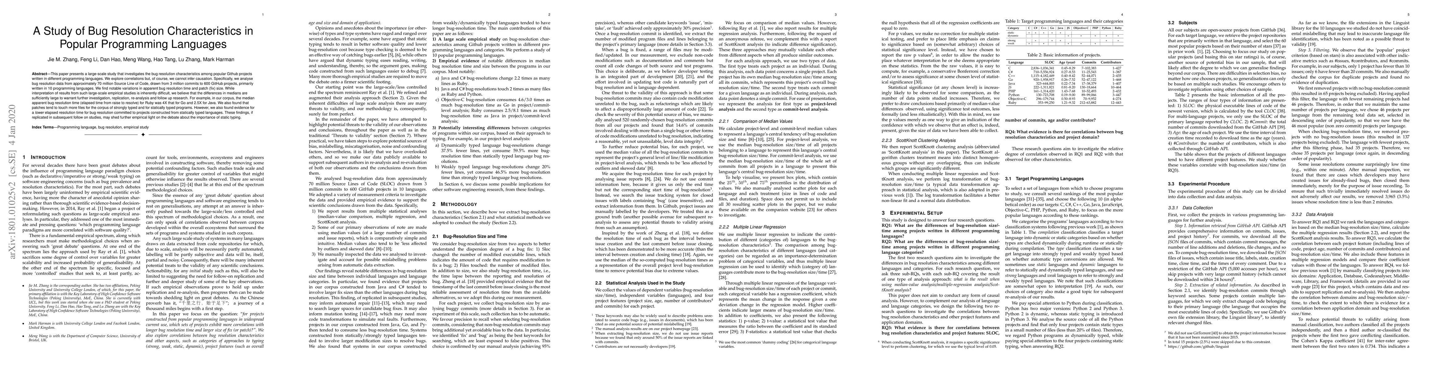 This study analyzes bug resolution characteristics across 600 GitHub projects in 10 popular programming languages, revealing significant variations in resolution time and patch size. Notably, Ruby had a median bug resolution time four times longer than Go and 2.5 times longer than Java, suggesting potential language-specific factors influencing bug resolution efficiency.