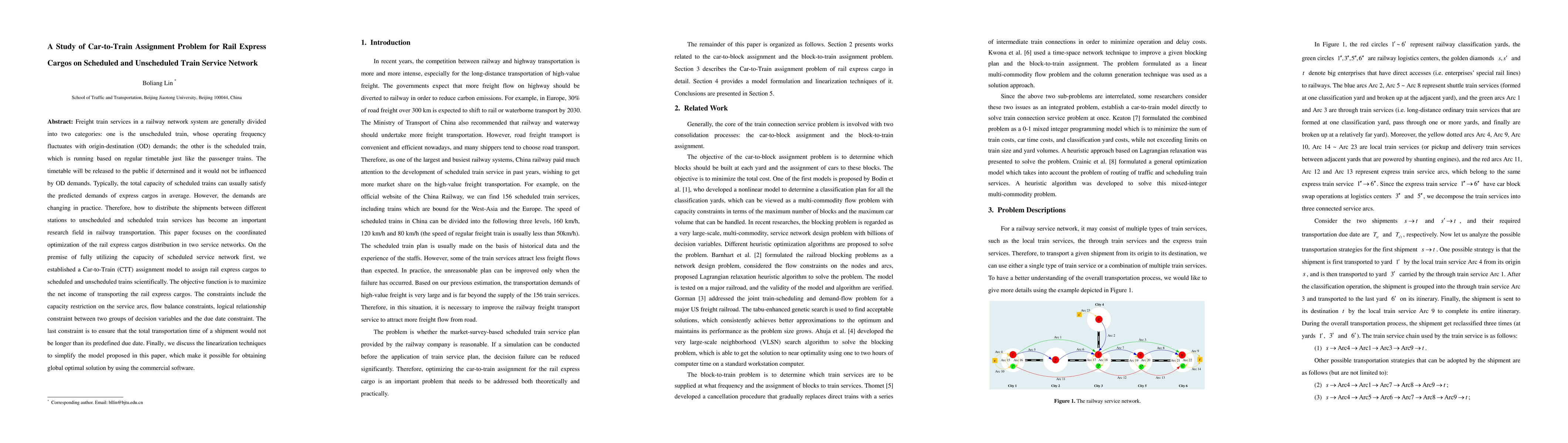 This paper develops a Car-to-Train assignment model to optimize the distribution of rail express cargos between scheduled and unscheduled train services, aiming to maximize net income while considering capacity, flow balance, and due date constraints. The model is linearized to facilitate global optimal solutions using commercial software.