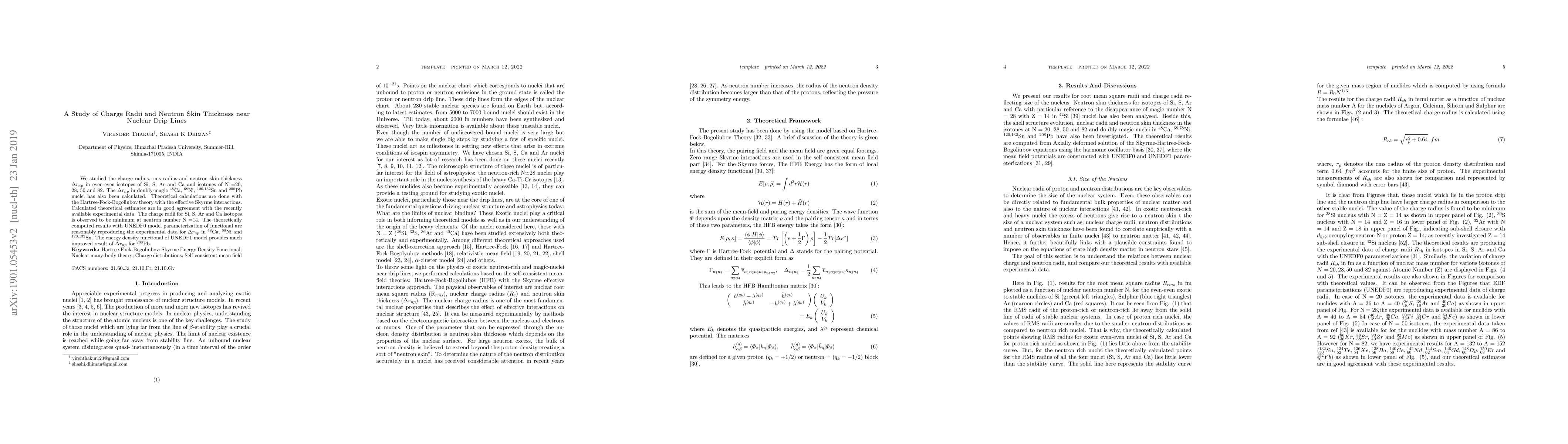 We studied the charge radius, rms radius and neutron skin thickness $\Delta r_{np}$ in even-even isotopes of Si, S, Ar and Ca and isotones of N =20, 28, 50 and 82. The $\Delta r_{np}$ in doubly-magic $^{48}$Ca, $^{68}$Ni, $^{120,132}$Sn and $^{208}$Pb nuclei has also been calculated. Theoretical calculations are done with the Hartree-Fock-Bogoliubov theory with the effective Skyrme interactions. Calculated theoretical estimates are in good agreement with the recently available experimental data. The charge radii for Si, S, Ar and Ca isotopes is observed to be minimum at neutron number N =14. The theoretically computed results with UNEDF0 model parameterization of functional are reasonably reproducing the experimental data for $\Delta r_{np}$ in $^{48}$Ca, $^{68}$Ni and $^{120,132}$Sn. The energy density functional of UNEDF1 model provides much improved result of $\Delta r_{np}$ for $^{208}$Pb.