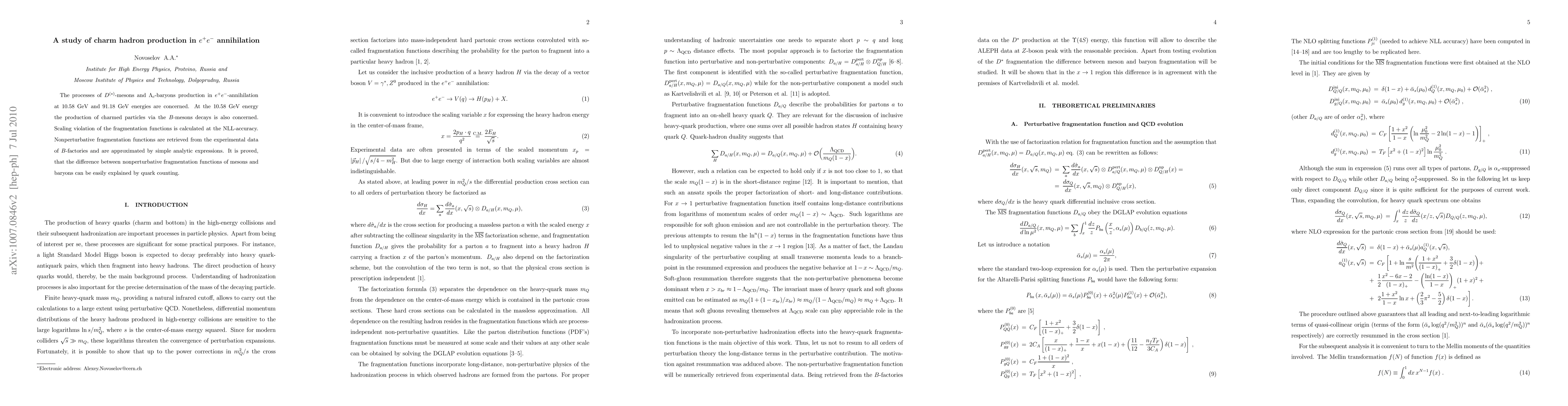 This study investigates charm hadron production in e^+e^- annihilation at 10.58 GeV and 91.18 GeV, focusing on D^{(*)}-mesons and \Lambda_c-baryons. It also examines charmed particle production via B-meson decays at 10.58 GeV, calculating scaling violations of fragmentation functions at NLL-accuracy and deriving nonperturbative functions from B-factory data.