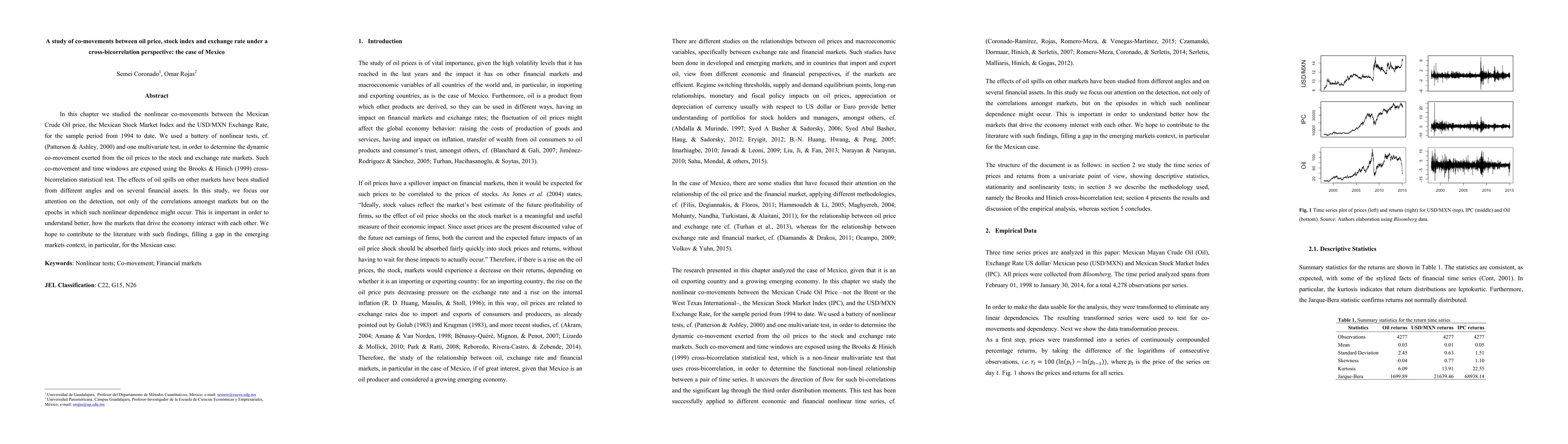 In this chapter we studied the nonlinear co-movements between the Mexican Crude Oil price, the Mexican Stock Market Index and the USD/MXN Exchange Rate, for the sample period from 1994 to date. We used a battery of nonlinear tests, cf. (Patterson & Ashley, 2000) and one multivariate test, in order to determine the dynamic co-movement exerted from the oil prices to the stock and exchange rate markets. Such co-movement and time windows are exposed using the Brooks & Hinich (1999) cross- bicorrelation statistical test. The effects of oil spills on other markets have been studied from different angles and on several financial assets. In this study, we focus our attention on the detection, not only of the correlations amongst markets but on the epochs in which such nonlinear dependence might occur. This is important in order to understand better, how the markets that drive the economy interact with each other. We hope to contribute to the literature with such findings, filling a gap in the emerging markets context, in particular, for the Mexican case.