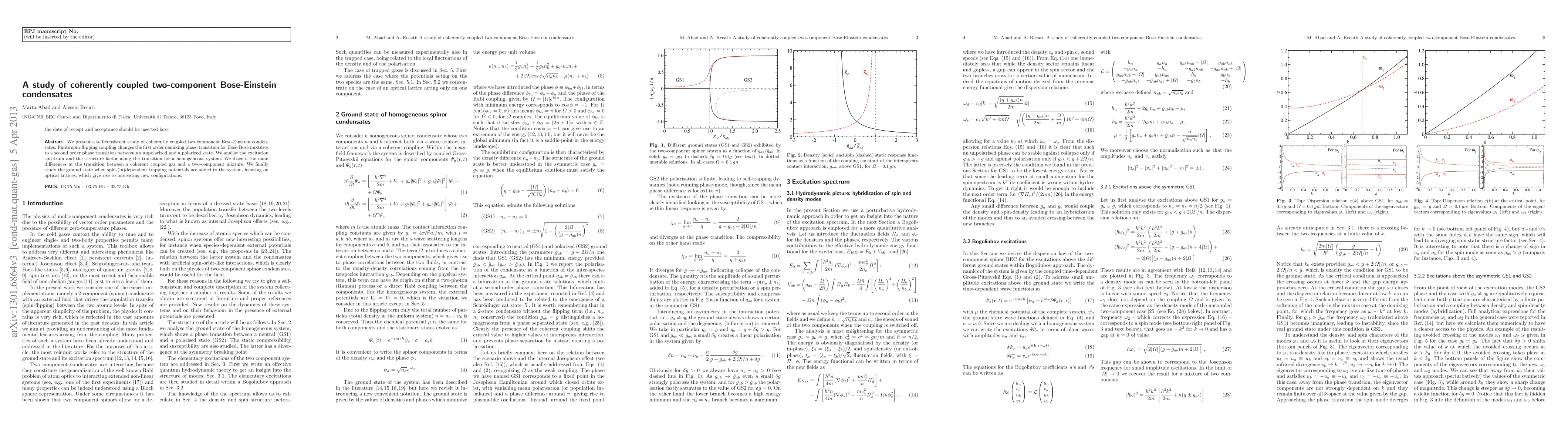 This paper investigates coherently coupled two-component Bose-Einstein condensates, showing that spin-flipping coupling transforms the demixing phase transition into a second-order transition. The study also explores the excitation spectrum and structure factor, highlighting differences between coupled gases and mixtures, and examines ground state configurations under spin-dependent trapping potentials, particularly in optical lattices.