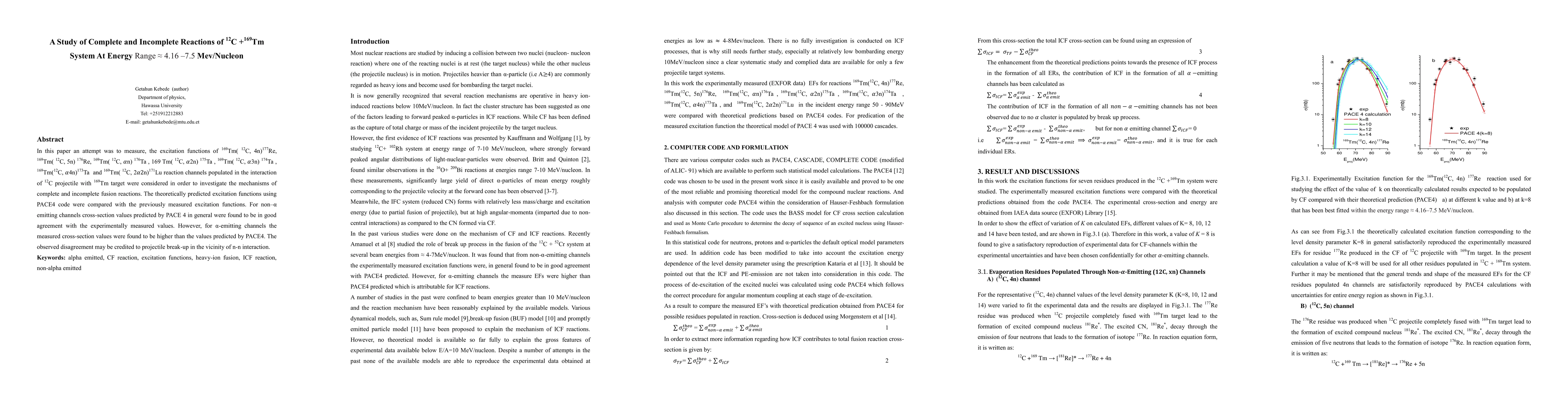 In this paper an attempt was to measure, the excitation functions of $^{169}$Tm($^{12}$C, 4n)$^{177}$Re, $^{169}$Tm($^{12}$C, 5n)$^{176}$Re, $^{169}$Tm($^{12}$C, $\alpha$n)$^{176}$Ta, $^{169}$Tm($^{12}$C, $\alpha$2n)$^{175}$Ta , $^{169}$Tm($^{12}$C, $\alpha$3n)$^{174}$Ta , $^{169}$Tm($^{12}$C, $\alpha$4n)$^{173}$Ta, and $^{169}$Tm($^{12}$C, 2$\alpha$2n)$^{171}$Lu reaction channels populated in the interaction of $^{12}$C projectile with $^{169}$Tm target were considered in order to investigate the mechanisms of complete and incomplete fusion reactions. The theoretically predicted excitation functions using PACE4 code were compared with the previously measured excitation functions. For non alpha emitting channels cross section values predicted by PACE4 in general were found to be in good agreement with the experimentally measured values. However, for alpha-emitting channels the measured cross-section values were found to be higher than the values predicted by PACE4. The observed disagreement may be credited to projectile break up in the vicinity of nn interaction. Keywords: alpha emitted, CF reaction, excitation functions, heavy ion fusion, incomplete fusion reaction, non alpha emitted