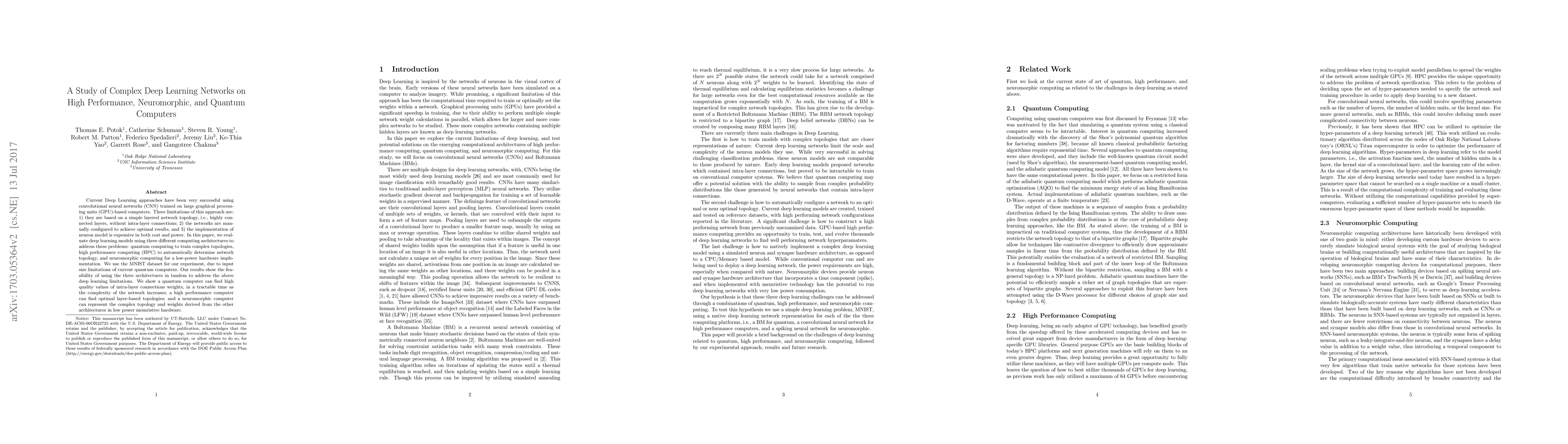 Current Deep Learning approaches have been very successful using convolutional neural networks (CNN) trained on large graphical processing units (GPU)-based computers. Three limitations of this approach are: 1) they are based on a simple layered network topology, i.e., highly connected layers, without intra-layer connections; 2) the networks are manually configured to achieve optimal results, and 3) the implementation of neuron model is expensive in both cost and power. In this paper, we evaluate deep learning models using three different computing architectures to address these problems: quantum computing to train complex topologies, high performance computing (HPC) to automatically determine network topology, and neuromorphic computing for a low-power hardware implementation. We use the MNIST dataset for our experiment, due to input size limitations of current quantum computers. Our results show the feasibility of using the three architectures in tandem to address the above deep learning limitations. We show a quantum computer can find high quality values of intra-layer connections weights, in a tractable time as the complexity of the network increases; a high performance computer can find optimal layer-based topologies; and a neuromorphic computer can represent the complex topology and weights derived from the other architectures in low power memristive hardware.