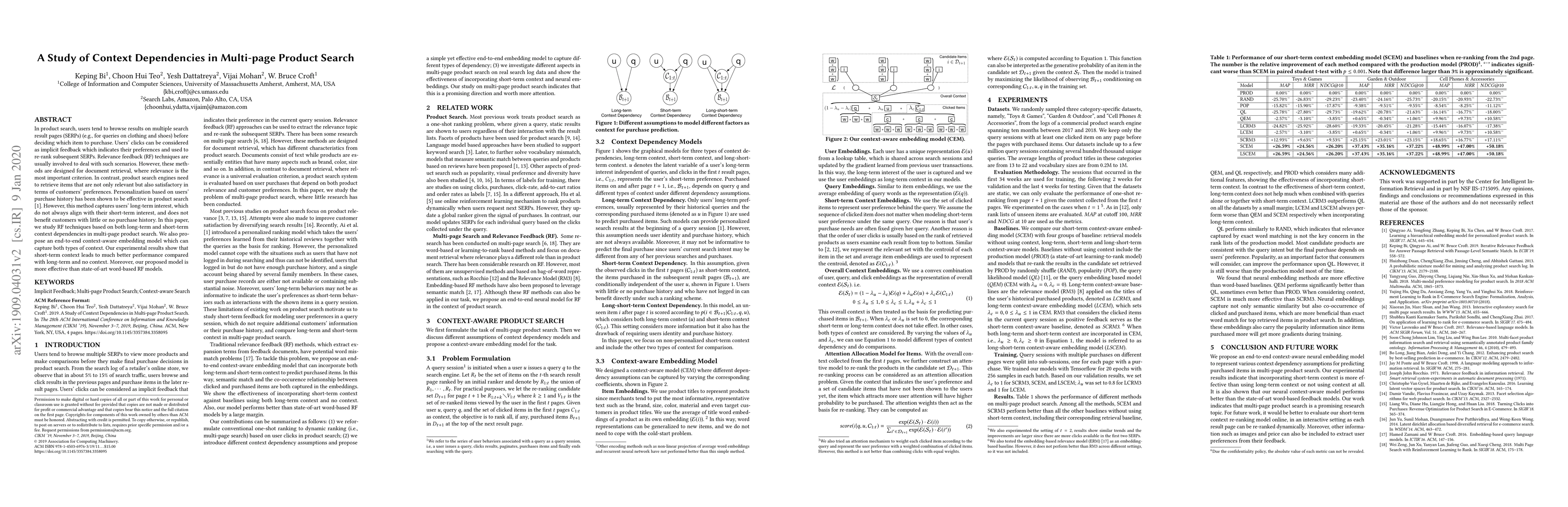 This paper investigates context-dependent relevance feedback techniques for multi-page product search, focusing on both long-term and short-term user preferences. The proposed context-aware embedding model outperforms existing word-based models, demonstrating that short-term context provides superior search performance.