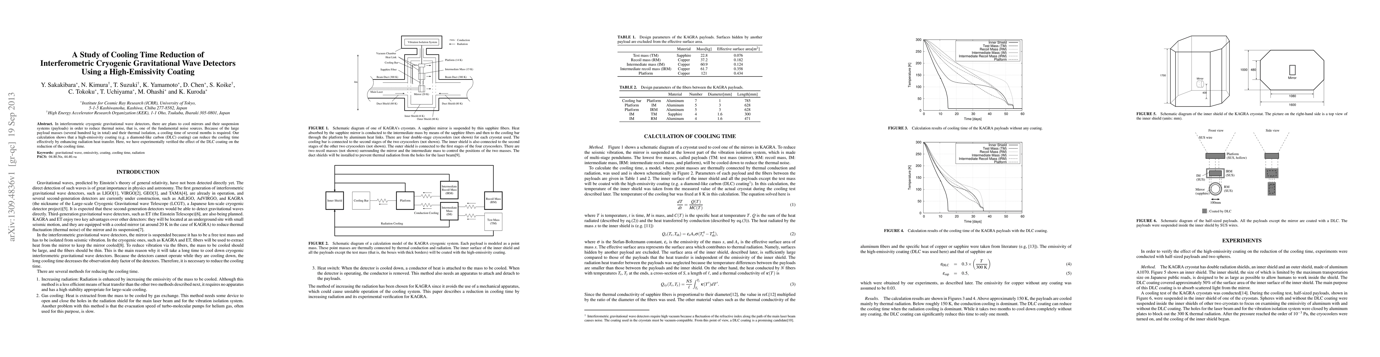 In interferometric cryogenic gravitational wave detectors, there are plans to cool mirrors and their suspension systems (payloads) in order to reduce thermal noise, that is, one of the fundamental noise sources. Because of the large payload masses (several hundred kg in total) and their thermal isolation, a cooling time of several months is required. Our calculation shows that a high-emissivity coating (e.g. a diamond-like carbon (DLC) coating) can reduce the cooling time effectively by enhancing radiation heat transfer. Here, we have experimentally verified the effect of the DLC coating on the reduction of the cooling time.
