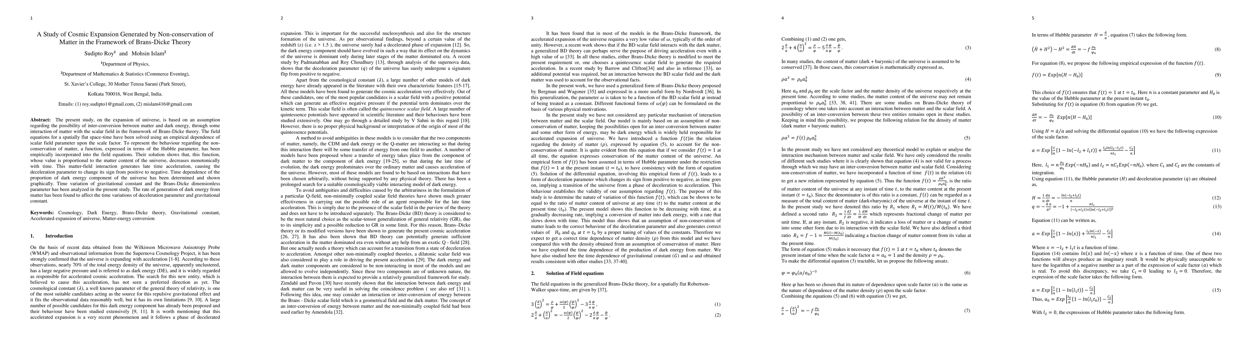 The present study, on the expansion of universe, is based on an assumption regarding the possibility of inter-conversion between matter and dark energy, through some interaction of matter with the scalar field in the framework of Brans-Dicke theory. The field equations for a spatially flat space-time have been solved using an empirical dependence of scalar field parameter upon the scale factor. To represent the behaviour regarding the non-conservation of matter, a function, expressed in terms of the Hubble parameter, has been empirically incorporated into the field equations. Their solution shows that, this function, whose value is proportional to the matter content of the universe, decreases monotonically with time. This matter-field interaction generates late time acceleration, causing the deceleration parameter to change its sign from positive to negative. Time dependence of the proportion of dark energy component of the universe has been determined and shown graphically. Time variation of gravitational constant and the Brans-Dicke dimensionless parameter has been analyzed in the present study. The rate of generation of dark energy from matter has been found to affect the time variations of deceleration parameter and gravitational constant.