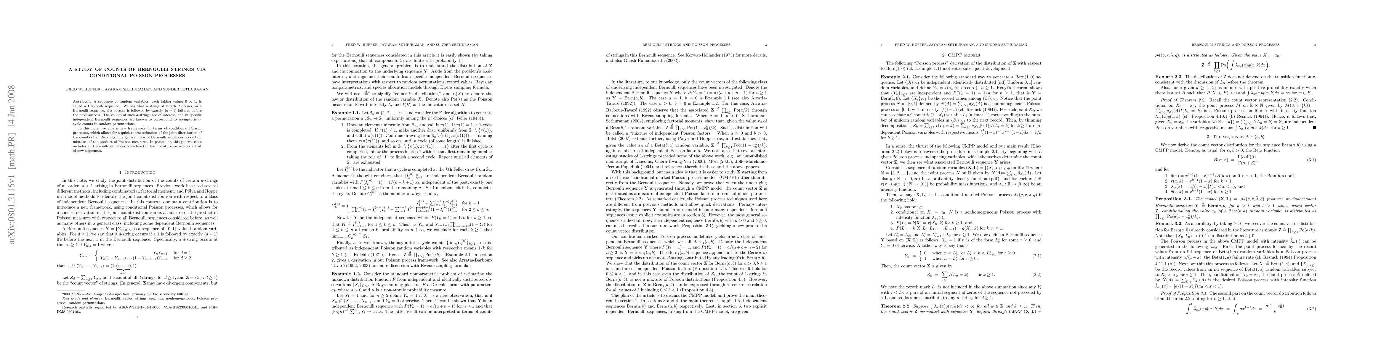 We say that a string of length $d$ occurs, in a Bernoulli sequence, if a success is followed by exactly $(d-1)$ failures before the next success. The counts of such $d$-strings are of interest, and in specific independent Bernoulli sequences are known to correspond to asymptotic $d$-cycle counts in random permutations. In this note, we give a new framework, in terms of conditional Poisson processes, which allows for a quick characterization of the joint distribution of the counts of all $d$-strings, in a general class of Bernoulli sequences, as certain mixtures of the product of Poisson measures. This general class includes all Bernoulli sequences considered before, as well many new sequences.