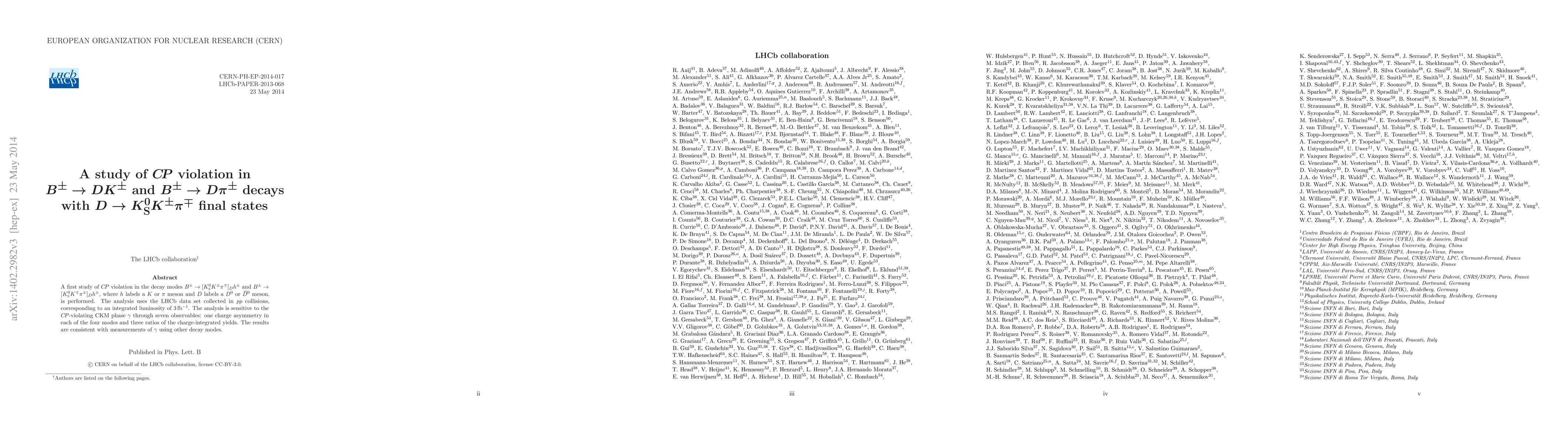 This study investigates CP violation in $B^\pm$ decays to $D K^\pm$ and $D \pi^\pm$ with $D$ decaying to $K^0_{\rm S} K^\pm \pi^\mp$, using LHCb data. The analysis identifies seven observables sensitive to the CP-violating CKM phase $\gamma$, yielding results consistent with previous measurements.