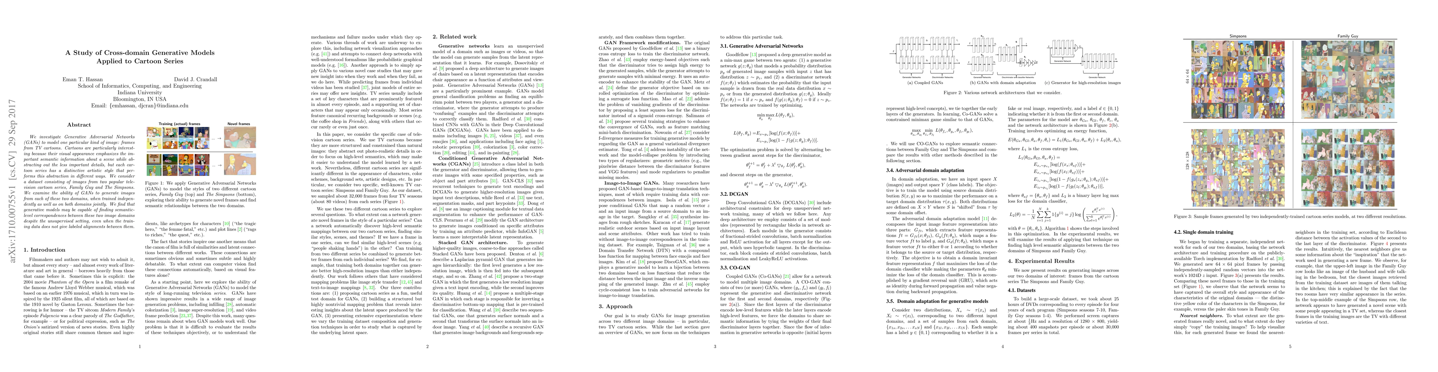 We investigate Generative Adversarial Networks (GANs) to model one particular kind of image: frames from TV cartoons. Cartoons are particularly interesting because their visual appearance emphasizes the important semantic information about a scene while abstracting out the less important details, but each cartoon series has a distinctive artistic style that performs this abstraction in different ways. We consider a dataset consisting of images from two popular television cartoon series, Family Guy and The Simpsons. We examine the ability of GANs to generate images from each of these two domains, when trained independently as well as on both domains jointly. We find that generative models may be capable of finding semantic-level correspondences between these two image domains despite the unsupervised setting, even when the training data does not give labeled alignments between them.