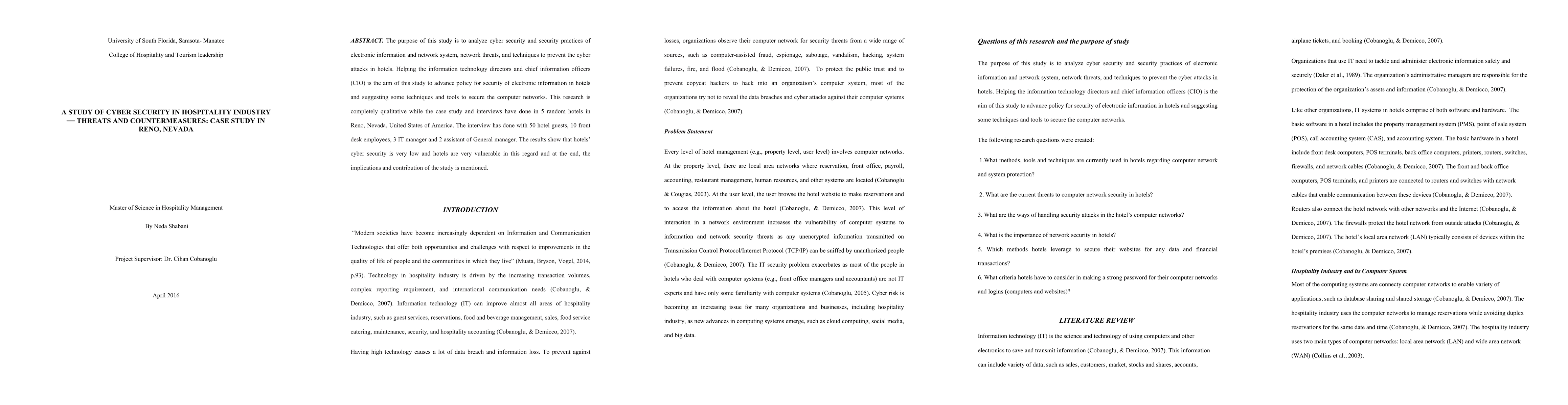 This study qualitatively examines the cybersecurity practices in five hotels in Reno, Nevada, revealing significant vulnerabilities and low security levels. The research aims to assist IT directors and CIOs in enhancing hotel network security through suggested techniques and tools.