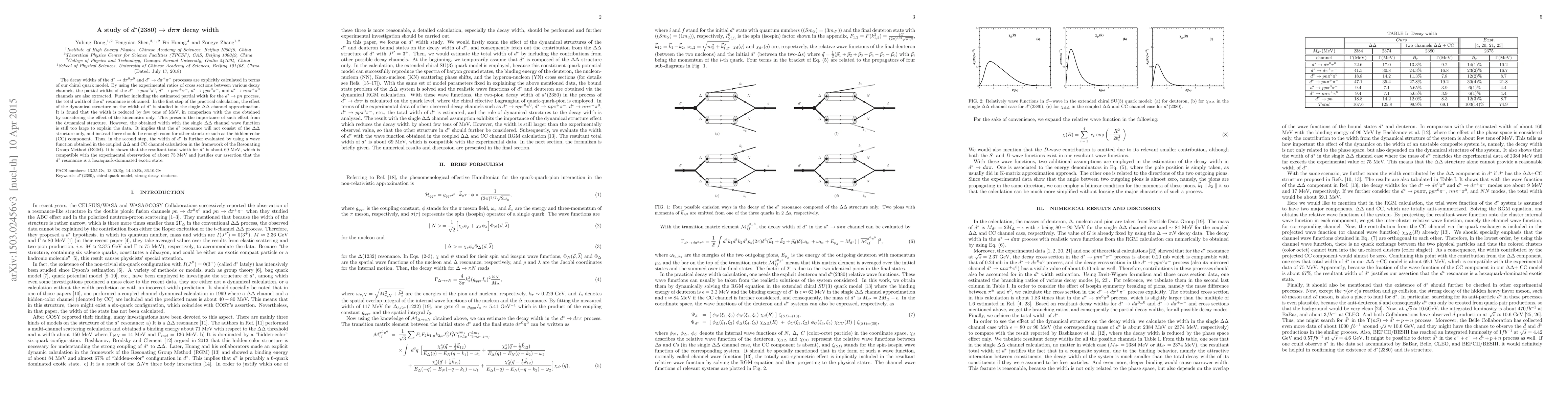 The decay widths of the $\ds\to d \pi^0\pi^0$ and $\ds\to d \pi^+\pi^-$ processes are explicitly calculated in terms of our chiral quark model. By using the experimental ratios of cross sections between various decay channels, the partial widths of the $\ds\to pn \pi^0\pi^0$, $\ds\to pn \pi^+\pi^-$, $\ds\to pp \pi^0\pi^-$, and $\ds\to nn \pi^+\pi^0$ channels are also extracted. Further including the estimated partial width for the $\ds\to pn $ process, the total width of the $\ds$ resonance is obtained. In the first step of the practical calculation, the effect of the dynamical structure on the width of $\ds$ is studied in the single $\Delta\Delta$ channel approximation. It is found that the width is reduced by few tens of MeV, in comparison with the one obtained by considering the effect of the kinematics only. This presents the importance of such effect from the dynamical structure. However, the obtained width with the single $\Delta\Delta$ channel wave function is still too large to explain the data. It implies that the $\ds$ resonance will not consist of the $\Delta\Delta$ structure only, and instead there should be enough room for other structure such as the hidden-color (CC) component. Thus, in the second step, the width of $\ds$ is further evaluated by using a wave function obtained in the coupled $\Delta\Delta$ and CC channel calculation in the framework of the Resonating Group Method (RGM). It is shown that the resultant total width for $\ds$ is about 69 MeV, which is compatible with the experimental observation of about 75 MeV and justifies our assertion that the $\ds$ resonance is a hexaquark-dominated exotic state.