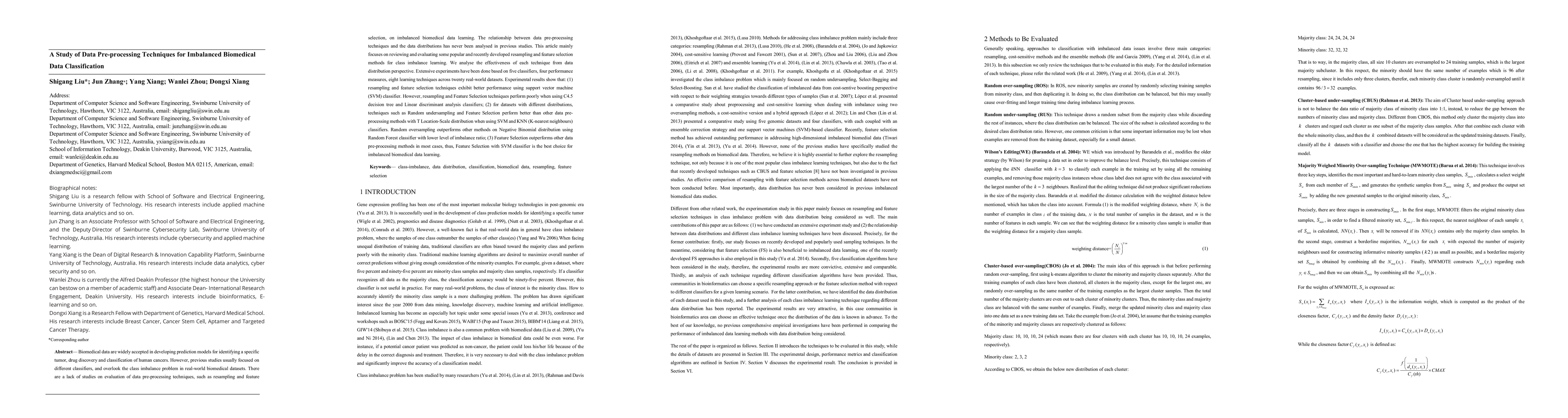 This study reviews and evaluates various resampling and feature selection techniques for handling class imbalance in biomedical datasets. Experimental results indicate that while resampling and feature selection techniques generally improve performance with SVM classifiers, they perform poorly with C4.5 and Linear discriminant analysis. Feature Selection, particularly when combined with SVM, emerges as the most effective method for most imbalanced biomedical data scenarios.