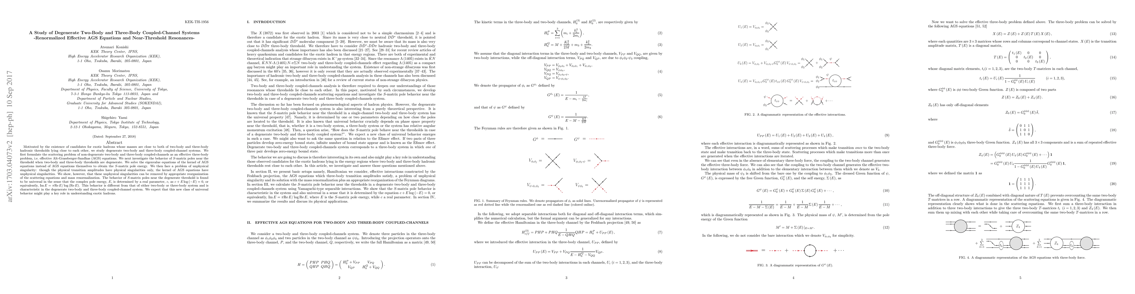 Motivated by the existence of candidates for exotic hadrons whose masses are close to both of two-body and three-body hadronic thresholds lying close to each other, we study degenerate two-body and three-body coupled-channel systems. We first formulate the scattering problem of non-degenerate two-body and three-body coupled-channels as an effective three-body problem, i.e.\ effective Alt-Grassberger-Sandhas (AGS) equations. We next investigate the behavior of $S$-matrix poles near the threshold when two-body and three-body thresholds are degenerate. We solve the eigenvalue equations of the kernel of AGS equations instead of AGS equations themselves to obtain the $S$-matrix pole energy. We then face a problem of unphysical singularity: though the physical transition amplitudes have physical singularities only, the kernel of AGS equations have unphysical singularities. We show, however, that these unphysical singularities can be removed by appropriate reorganization of the scattering equations and mass renormalization. The behavior of $S$-matrix poles near the degenerate threshold is found to be universal in the sense that the complex pole energy, $E$, is determined by a real parameter, $c$, as $c - E \log{\left( - E \right)} = 0$, or equivalently, ${\rm Im} E = - \pi {\rm Re} E / \log{\mid {\rm Re} E \mid}$. This behavior is different from that of either two-body or three-body system and is characteristic in the degenerate two-body and three-body coupled-channel system. We expect that this new class of universal behavior might play a key role in understanding exotic hadrons.