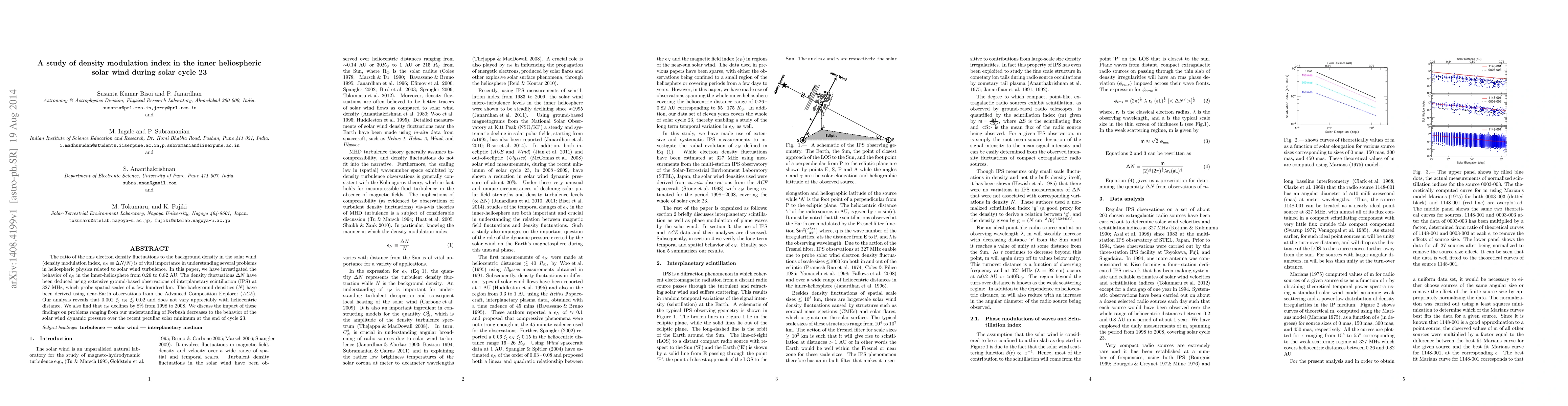 A study investigated density modulation index in the inner heliosphere during solar cycle 23, finding that fluctuations vary between 0.001% and 2% of background densities with little change at different distances from Earth.