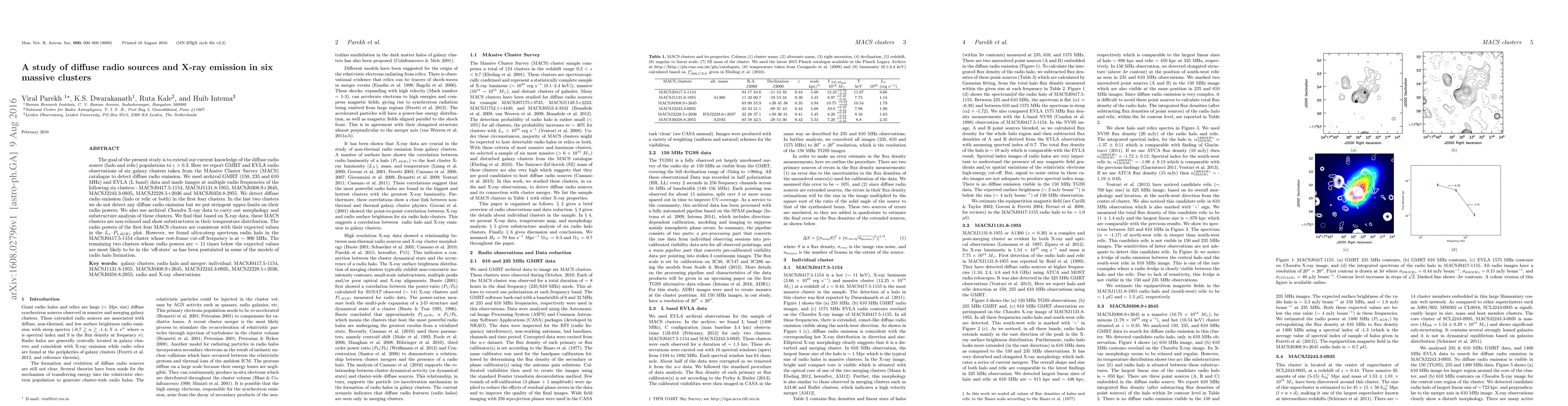 This study uses GMRT and EVLA radio observations to detect diffuse radio emission in six massive galaxy clusters from the MACS catalogue, finding radio halos or relics in four clusters and no emission in the other two, with stringent upper limits on their radio powers. X-ray data from Chandra reveal non-relaxed structures and temperature distributions in the clusters, with the radio powers of the four clusters generally aligning with expectations, except for an ultra-steep spectrum halo in MACSJ0417.5-1154.
