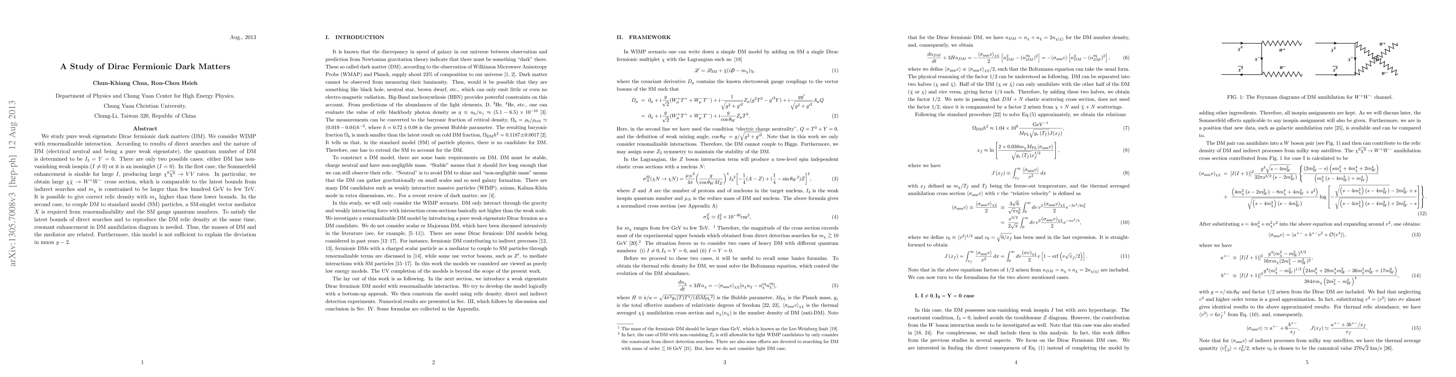 We study pure weak eigenstate Dirac fermionic dark matters (DM). We consider WIMP with renormalizable interaction. According to results of direct searches and the nature of DM (electrical neutral and being a pure weak eigenstate), the quantum number of DM is determined to be $I_3=Y=0$. There are only two possible cases: either DM has non-vanishing weak isospin ($I\neq 0$) or it is an isosinglet (I=0). In the first case, the Sommerfeld enhancement is sizable for large $I$, producing large $\chi^0\bar{\chi^0}\to VV$ rates. In particular, we obtain large $\chi\bar\chi\to W^+ W^-$ cross section, which is comparable to the latest bounds from indirect searches and $m_\chi$ is constrained to be larger than few hundred GeV to few TeV. It is possible to give correct relic density with $m_\chi$ higher than these lower bounds. In the second case, to couple DM to standard model (SM) particles, a SM-singlet vector mediator $X$ is required from renormalizability and the SM gauge quantum numbers. To satisfy the latest bounds of direct searches and to reproduce the DM relic density at the same time, resonant enhancement in DM annihilation diagram is needed. Thus, the masses of DM and the mediator are related. Furthermore, this model is not sufficient to explain the deviation in muon $g-2$.