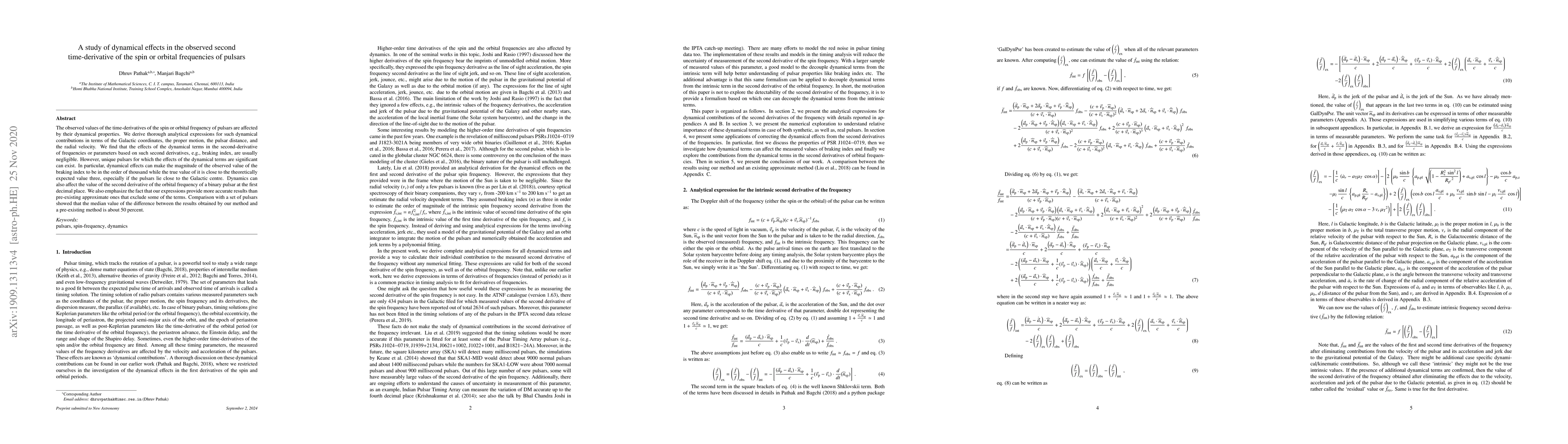 The observed values of the time-derivatives of the spin or orbital frequency of pulsars are affected by their dynamical properties. We derive thorough analytical expressions for such dynamical contributions in terms of the Galactic coordinates, the proper motion, the pulsar distance, and the radial velocity. We find that the effects of the dynamical terms in the second-derivative of frequencies or parameters based on such second derivatives, e.g., braking index, are usually negligible. However, unique pulsars for which the effects of the dynamical terms are significant can exist. In particular, dynamical effects can make the magnitude of the observed value of the braking index to be in the order of thousand while the true value of it is close to the theoretically expected value three, especially if the pulsars lie close to the Galactic centre. Dynamics can also affect the value of the second derivative of the orbital frequency of a binary pulsar at the first decimal place. We also emphasize the fact that our expressions provide more accurate results than pre-existing approximate ones that exclude some of the terms. Comparison with a set of pulsars showed that the median value of the difference between the results obtained by our method and a pre-existing method is about 50 percent.
