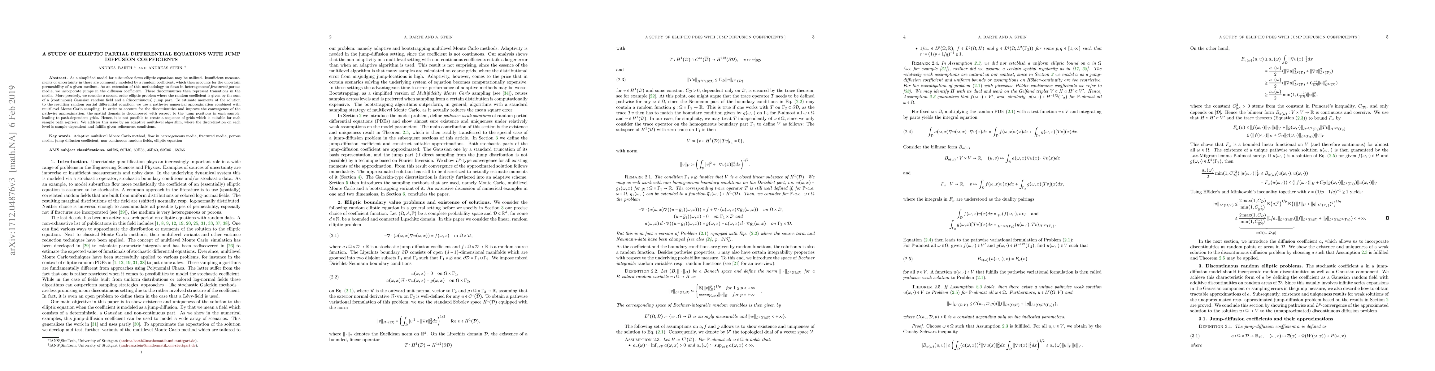 As a simplified model for subsurface flows elliptic equations may be utilized. Insufficient measurements or uncertainty in those are commonly modeled by a random coefficient, which then accounts for the uncertain permeability of a given medium. As an extension of this methodology to flows in heterogeneous\fractured\porous media, we incorporate jumps in the diffusion coefficient. These discontinuities then represent transitions in the media. More precisely, we consider a second order elliptic problem where the random coefficient is given by the sum of a (continuous) Gaussian random field and a (discontinuous) jump part. To estimate moments of the solution to the resulting random partial differential equation, we use a pathwise numerical approximation combined with multilevel Monte Carlo sampling. In order to account for the discontinuities and improve the convergence of the pathwise approximation, the spatial domain is decomposed with respect to the jump positions in each sample, leading to pathdependent grids. Hence, it is not possible to create a nested sequence of grids which is suitable for each sample path a-priori. We address this issue by an adaptive multilevel algorithm, where the discretization on each level is sample-dependent and fulfills given refinement conditions.