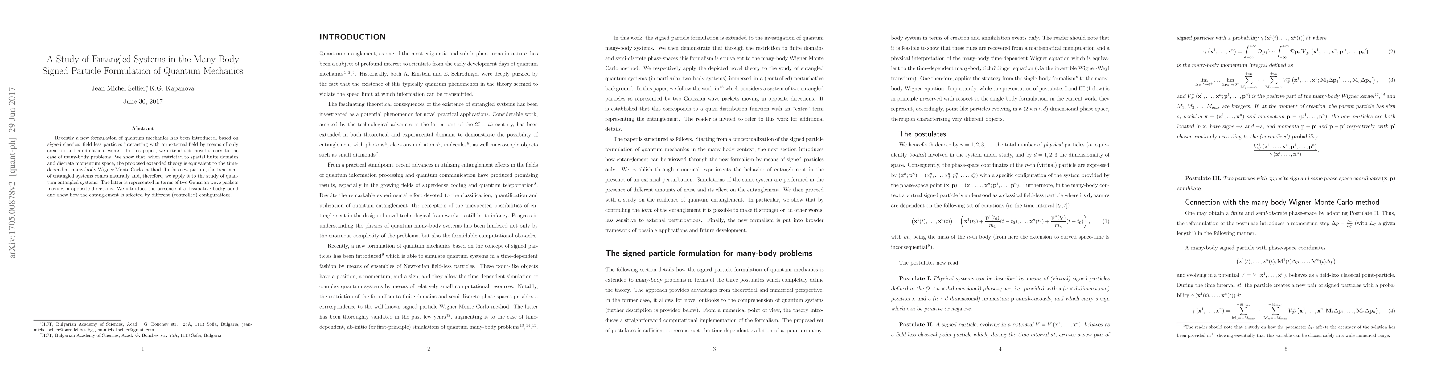 Recently a new formulation of quantum mechanics has been introduced, based on signed classical field-less particles interacting with an external field by means of only creation and annihilation events. In this paper, we extend this novel theory to the case of many-body problems. We show that, when restricted to spatial finite domains and discrete momentum space, the proposed extended theory is equivalent to the time-dependent many-body Wigner Monte Carlo method. In this new picture, the treatment of entangled systems comes naturally and, therefore, we apply it to the study of quantum entangled systems. The latter is represented in terms of two Gaussian wave packets moving in opposite directions. We introduce the presence of a dissipative background and show how the entanglement is affected by different (controlled) configurations.