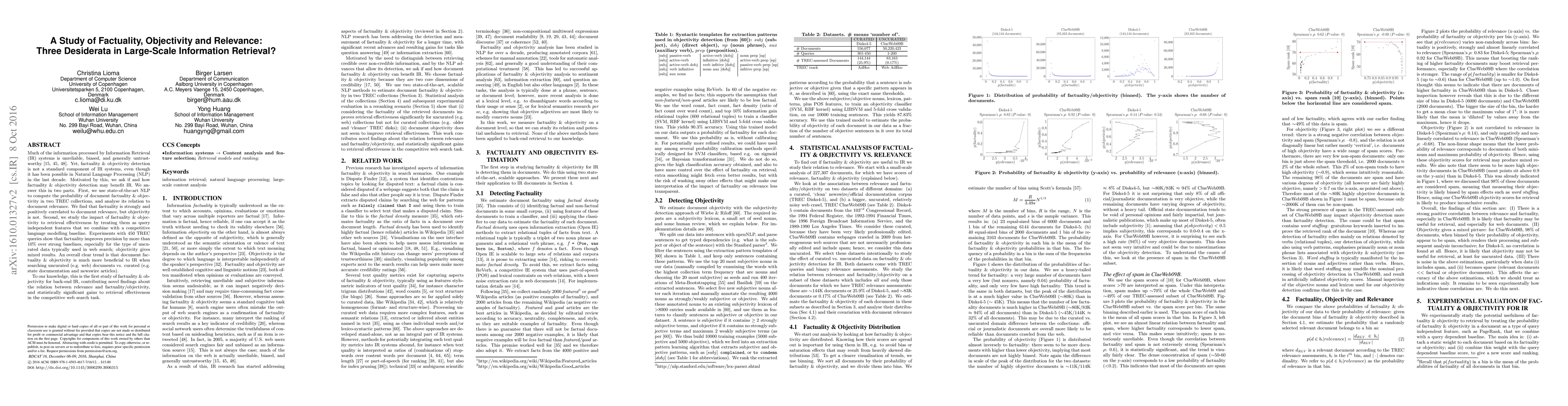 This study investigates the impact of factuality and objectivity detection in large-scale information retrieval, finding that factuality strongly correlates with document relevance and improves precision by over 10% in web search contexts. Objectivity shows mixed results, highlighting the greater benefit of factuality in uncurated data compared to curated sources.