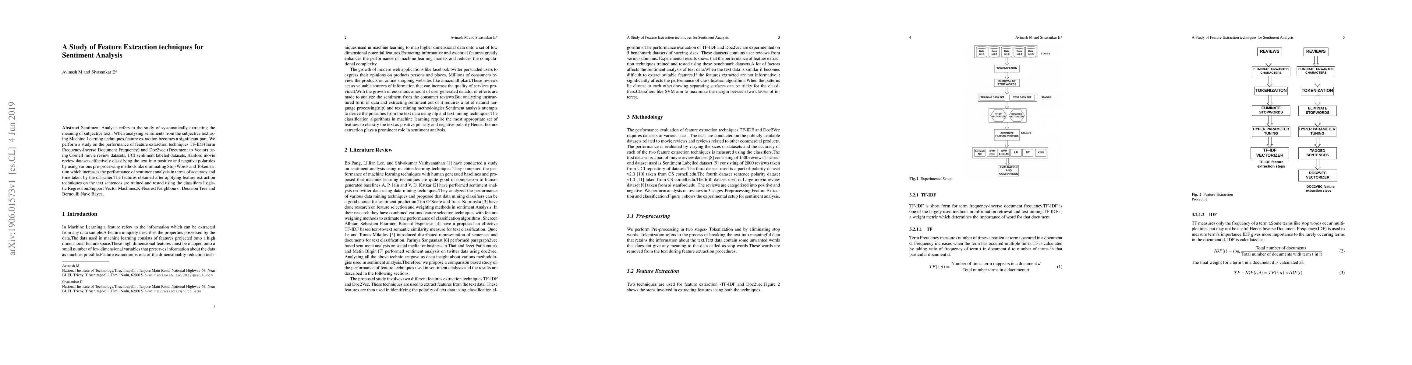This study evaluates TF-IDF and Doc2vec feature extraction techniques for sentiment analysis using various datasets, applying preprocessing methods to improve accuracy. Classification results with Logistic Regression, SVM, KNN, Decision Tree, and Bernoulli Naive Bayes are analyzed for performance.