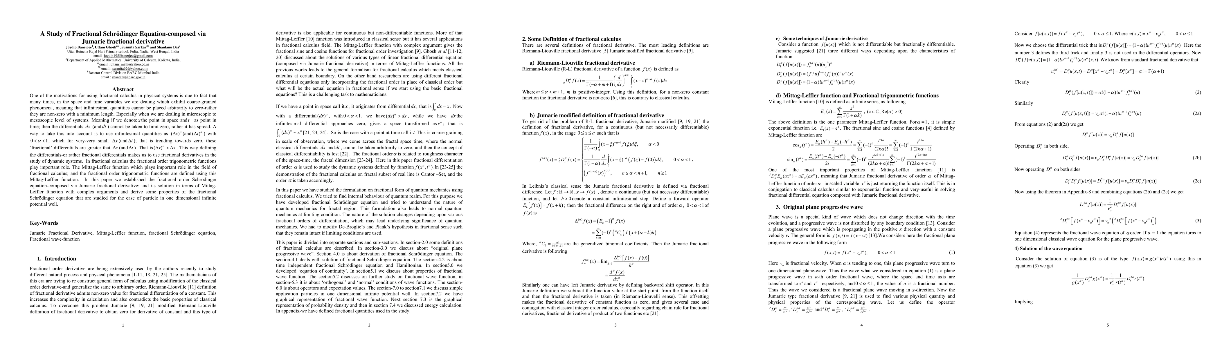 One of the motivations for using fractional calculus in physical systems is due to fact that many times, in the space and time variables we are dealing which exhibit coarse-grained phenomena, meaning that infinitesimal quantities cannot be placed arbitrarily to zero-rather they are non-zero with a minimum length. Especially when we are dealing in microscopic to mesoscopic level of systems. Meaning if we denote x the point in space and t as point in time; then the differentials dx (and dt) cannot be taken to limit zero, rather it has spread. A way to take this into account is to use infinitesimal quantities as (\Deltax)^\alpha (and (\Deltat)^\alpha) with 0<\alpha<1, which for very-very small \Deltax (and \Deltat); that is trending towards zero, these 'fractional' differentials are greater that \Deltax (and \Deltat). That is (\Deltax)^\alpha>\Deltax. This way defining the differentials-or rather fractional differentials makes us to use fractional derivatives in the study of dynamic systems. In fractional calculus the fractional order trigonometric functions play important role. The Mittag-Leffler function which plays important role in the field of fractional calculus; and the fractional order trigonometric functions are defined using this Mittag-Leffler function. In this paper we established the fractional order Schrodinger equation-composed via Jumarie fractional derivative; and its solution in terms of Mittag-Leffler function with complex arguments and derive some properties of the fractional Schrodinger equation that are studied for the case of particle in one dimensional infinite potential well.