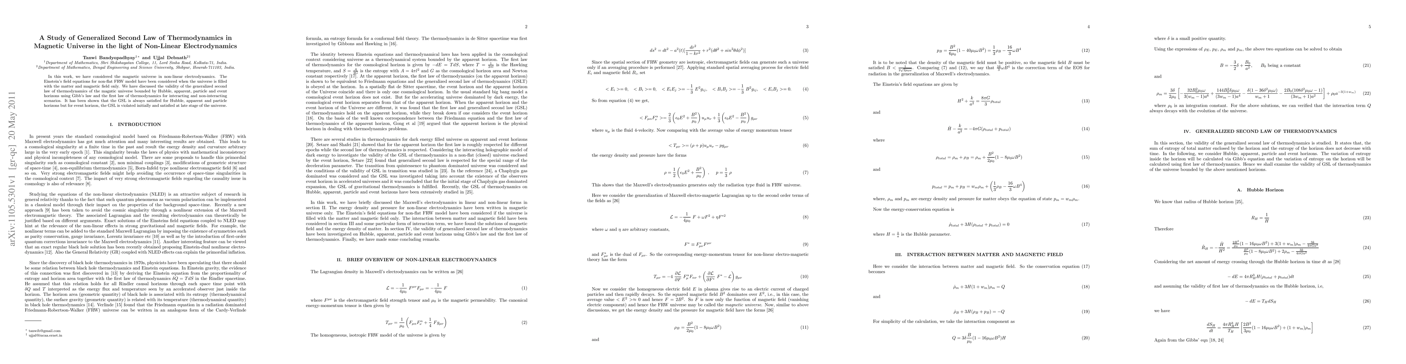 This paper investigates the generalized second law of thermodynamics in a magnetic universe influenced by non-linear electrodynamics. It finds that the generalized second law holds for Hubble, apparent, and particle horizons, but initially violates for the event horizon, eventually satisfying it in the universe's late stage.