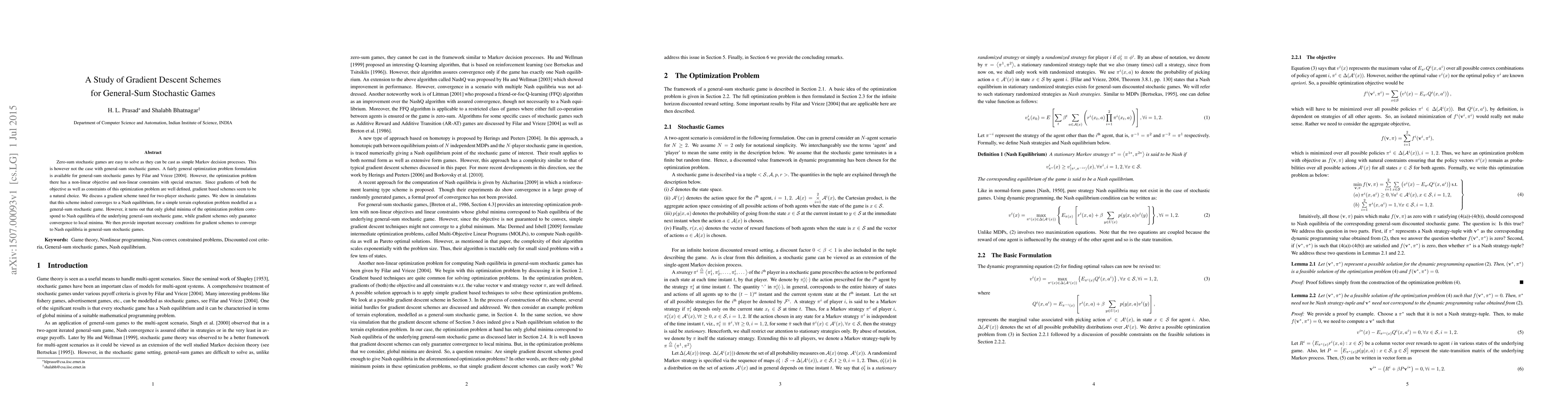 This paper explores gradient descent schemes for solving general-sum stochastic games, demonstrating their convergence to Nash equilibria in simulations. However, it highlights that only global minima of the optimization problem correspond to true Nash equilibria, while gradient schemes typically converge to local minima.
