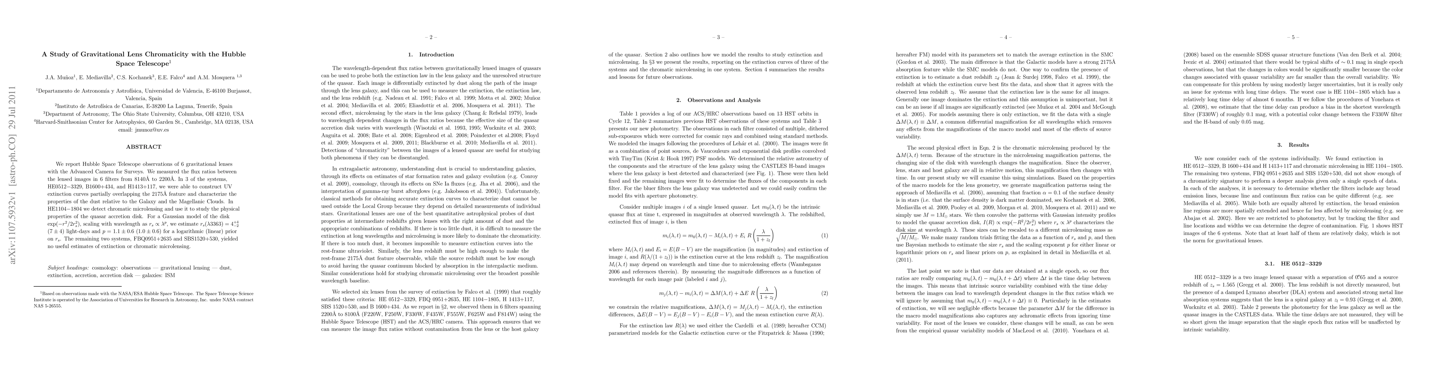 We report Hubble Space Telescope observations of 6 gravitational lenses with the Advanced Camera for Surveys. We measured the flux ratios between the lensed images in 6 filters from 8140\AA\ to 2200\AA. In 3 of the systems, HE0512$-$3329, B1600+434, and H1413+117, we were able to construct UV extinction curves partially overlapping the 2175\AA\ feature and characterize the properties of the dust relative to the Galaxy and the Magellanic Clouds. In HE1104$-$1804 we detect chromatic microlensing and use it to study the physical properties of the quasar accretion disk. For a Gaussian model of the disk $\exp(-r^2/2 r_s^2)$, scaling with wavelength as $r_s \propto \lambda^p$, we estimate $r_s(\lambda3363)=4^{+4}_{-2}$ ($7\pm 4$) light-days and $p=1.1\pm 0.6$ ($1.0\pm 0.6$) for a logarithmic (linear) prior on $r_s$. The remaining two systems, FBQ0951+2635 and SBS1520+530, yielded no useful estimates of extinction or chromatic microlensing.