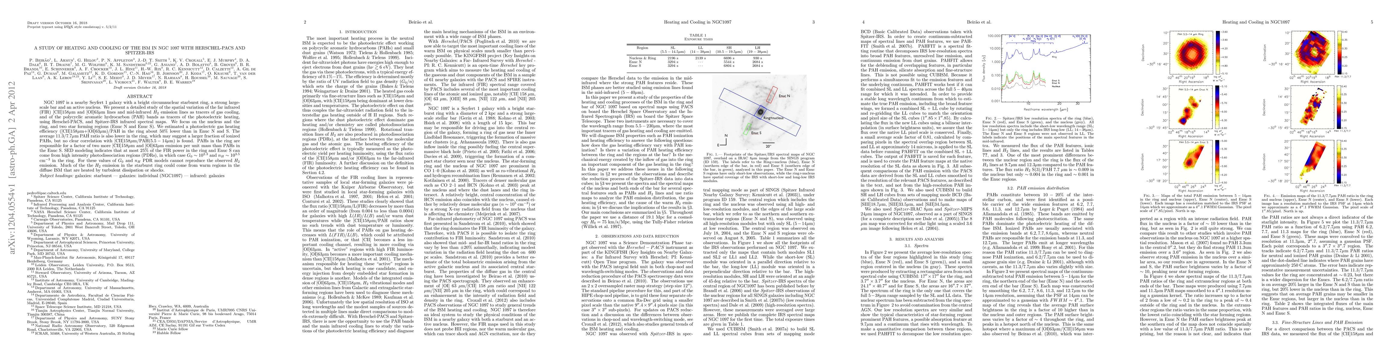 NGC 1097 is a nearby Seyfert 1 galaxy with a bright circumnuclear starburst ring, a strong large-scale bar and an active nucleus. We present a detailed study of the spatial variation of the far infrared (FIR) [CII]158um and [OI]63um lines and mid-infrared H2 emission lines as tracers of gas cooling, and of the polycyclic aromatic hydrocarbon (PAH) bands as tracers of the photoelectric heating, using Herschel-PACS, and Spitzer-IRS infrared spectral maps. We focus on the nucleus and the ring, and two star forming regions (Enuc N and Enuc S). We estimated a photoelectric gas heating efficiency ([CII]158um+[OI]63um)/PAH in the ring about 50% lower than in Enuc N and S. The average 11.3/7.7um PAH ratio is also lower in the ring, which may suggest a larger fraction of ionized PAHs, but no clear correlation with [CII]158{\mu}m/PAH(5.5 - 14um) is found. PAHs in the ring are responsible for a factor of two more [CII]158um and [OI]63um emission per unit mass than PAHs in the Enuc S. SED modeling indicates that at most 25% of the FIR power in the ring and Enuc S can come from high intensity photodissociation regions (PDRs), in which case G0 ~ 10^2.3 and nH ~ 10^3.5 cm^-3 in the ring. For these values of G0 and nH PDR models cannot reproduce the observed H2 emission. Much of the the H2 emission in the starburst ring could come from warm regions in the diffuse ISM that are heated by turbulent dissipation or shocks.