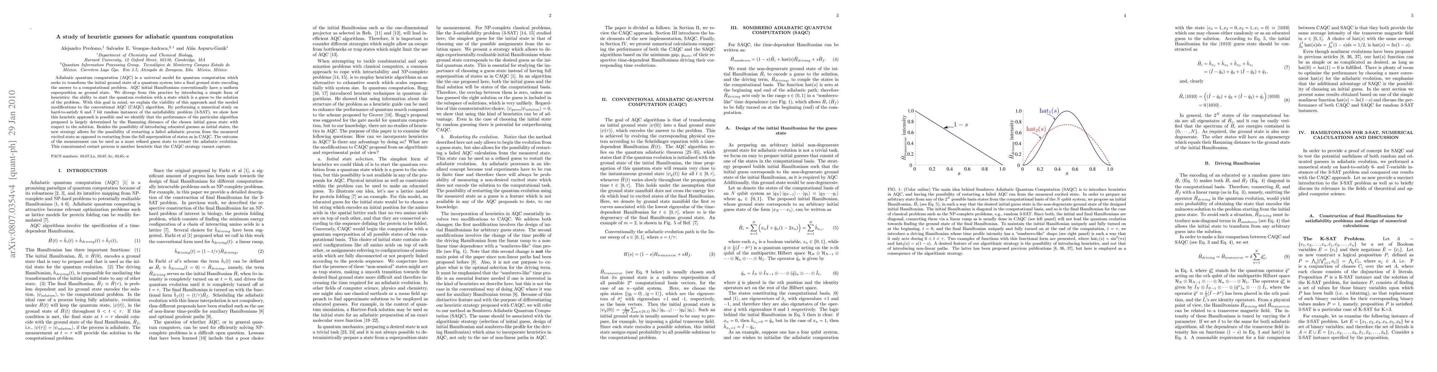 This study explores heuristic guesses in adiabatic quantum computation (AQC) by starting quantum evolution with a guessed solution state, demonstrating viability through numerical simulations on 3-SAT problems. The performance is largely influenced by the Hamming distance from the actual solution, and the approach allows for restarting failed processes from measured excited states, offering a more refined guess state.
