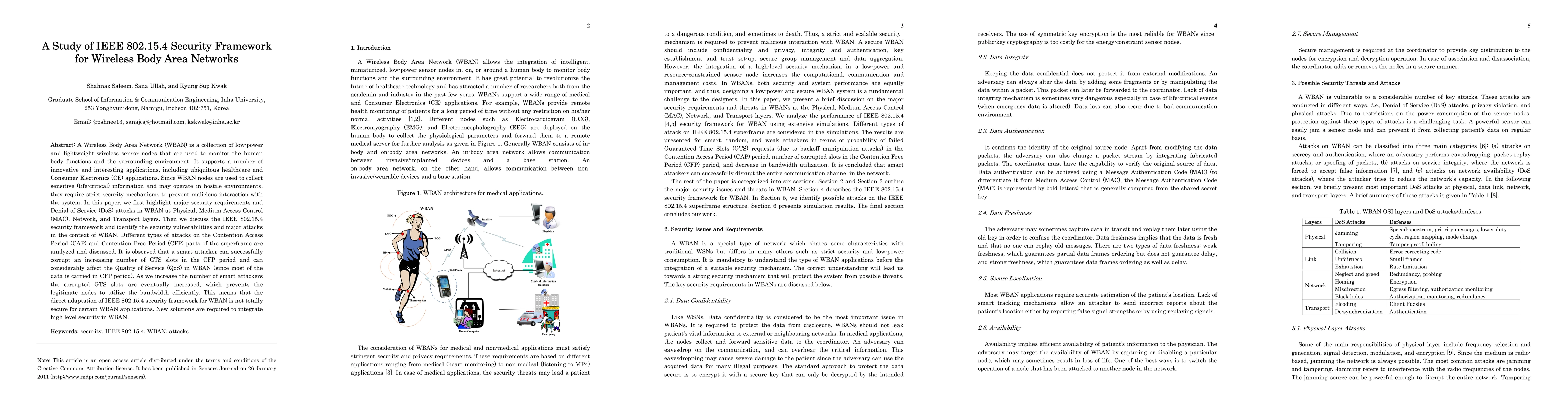 This paper examines the security vulnerabilities in the IEEE 802.15.4 framework for Wireless Body Area Networks (WBAN), highlighting major security requirements and Denial of Service (DoS) attacks across various layers. It concludes that the direct adaptation of IEEE 802.15.4 security is insufficient for certain WBAN applications, necessitating new solutions for enhanced security.