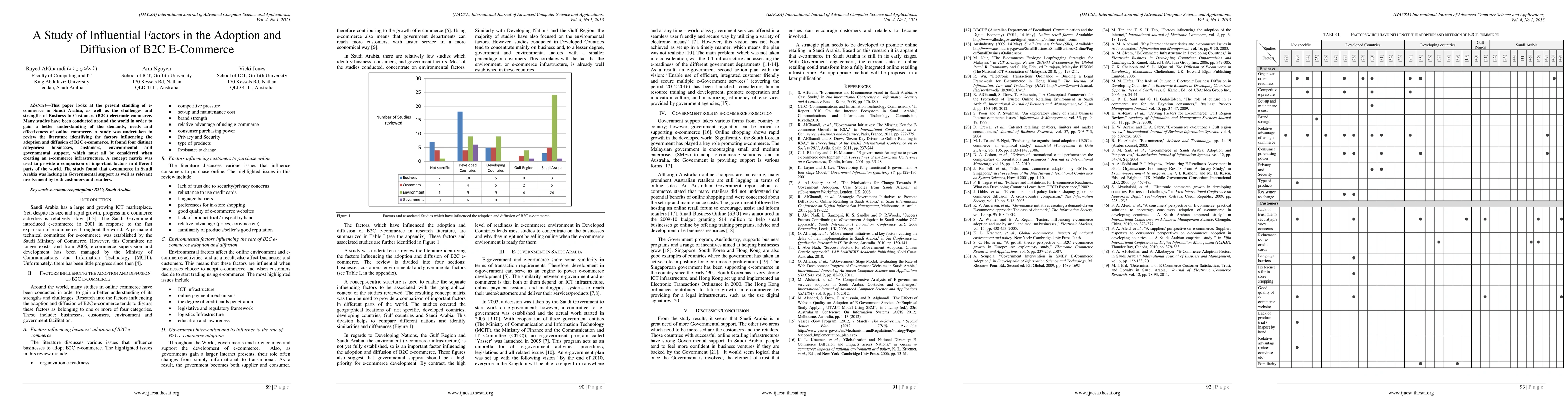 This study identifies influential factors in the adoption and diffusion of B2C e-commerce in Saudi Arabia, categorizing them into businesses, customers, environmental, and governmental support. It highlights a lack of governmental support and customer/retailer involvement in Saudi e-commerce.