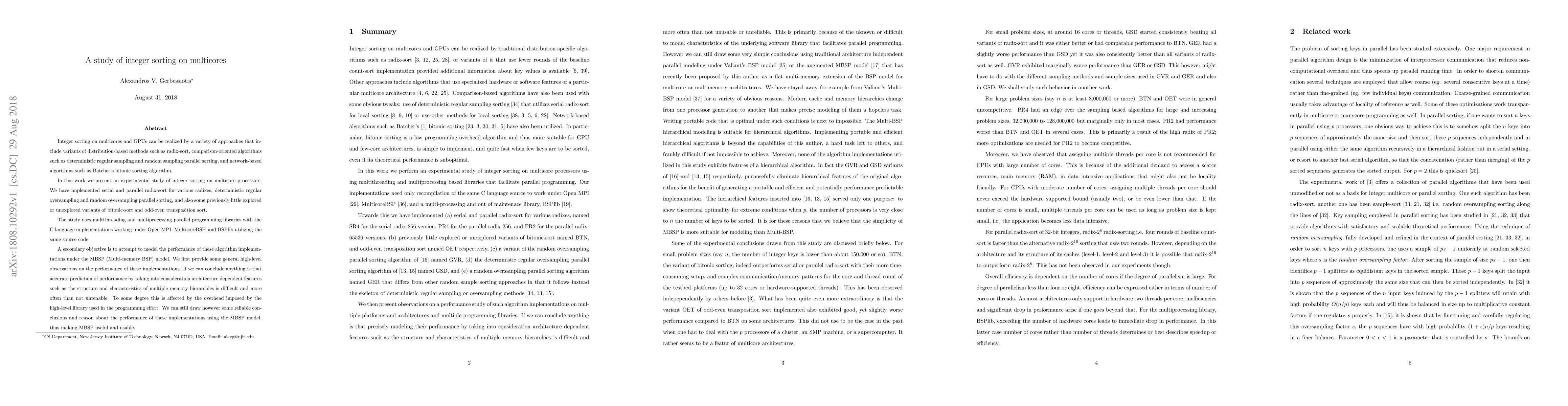 This study experimentally evaluates integer sorting algorithms on multicore processors, implementing and comparing serial and parallel radix-sort, parallel sorting methods, and variants of bitonic-sort and odd-even transposition sort. The research highlights the difficulty of accurately predicting performance based on architecture-dependent features, but concludes that the MBSP model can still provide reliable insights into algorithm performance.