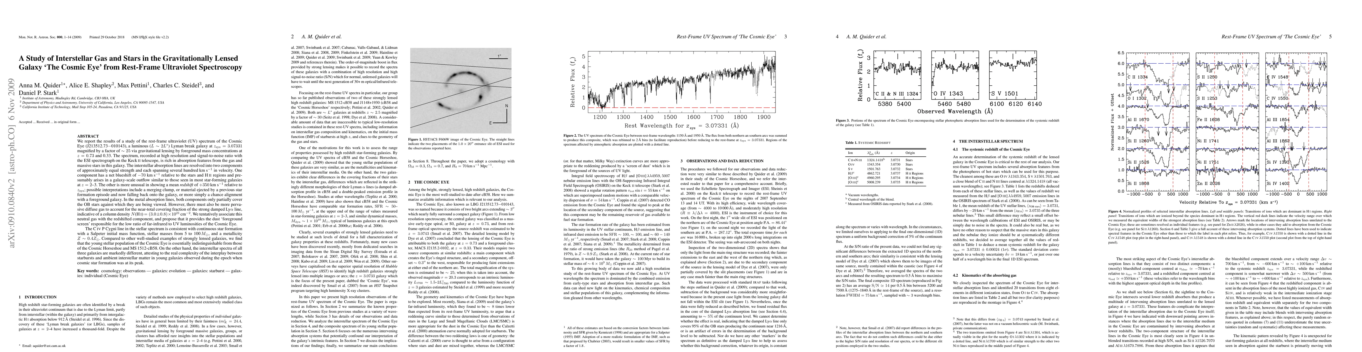 We report the results of a study of the rest-frame UV spectrum of the Cosmic Eye, a luminous Lyman break galaxy at z=3.07331 gravitationally lensed by a factor of 25. The spectrum, recorded with the ESI spectrograph on the Keck II telescope, is rich in absorption features from the gas and massive stars in this galaxy. The interstellar absorption lines are resolved into two components of approximately equal strength and each spanning several hundred km/s in velocity. One component has a net blueshift of -70 km/s relative to the stars and H II regions and presumably arises in a galaxy-scale outflow similar to those seen in most star-forming galaxies at z = 2-3. The other is more unusual in showing a mean redshift of +350 km/s relative to the systemic redshift; possible interpretations include a merging clump, or material ejected by a previous star formation episode and now falling back onto the galaxy, or more simply a chance alignment with a foreground galaxy. In the metal absorption lines, both components only partially cover the OB stars against which they are being viewed. We tentatively associate the redshifted component with the strong damped Lyman alpha line, indicative of a column density N(H I) = (3.0 +/- 0.8) x 10(21) atoms/cm2, and propose that it provides the dust `foreground screen' responsible for the low ratio of far-infrared to UV luminosities of the Cosmic Eye. Compared to other well-studied examples of strongly lensed galaxies, we find that the young stellar population of the Cosmic Eye is essentially indistinguishable from those of the Cosmic Horseshoe and MS 1512-cB58, while the interstellar spectra of all three galaxies are markedly different, attesting to the real complexity of the interplay between starbursts and ambient interstellar matter in young galaxies (abridged).