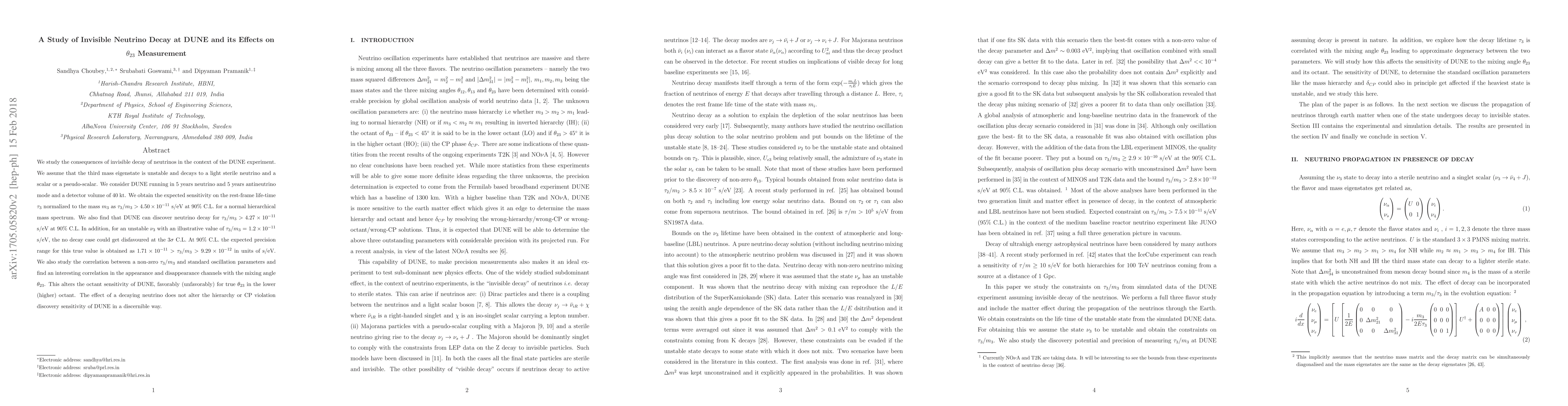 The DUNE experiment's ability to detect neutrino decay is explored, with bounds on a sterile neutrino's lifetime set, and correlations between decay lifetimes and mixing angles found, altering the octant sensitivity of DUNE.