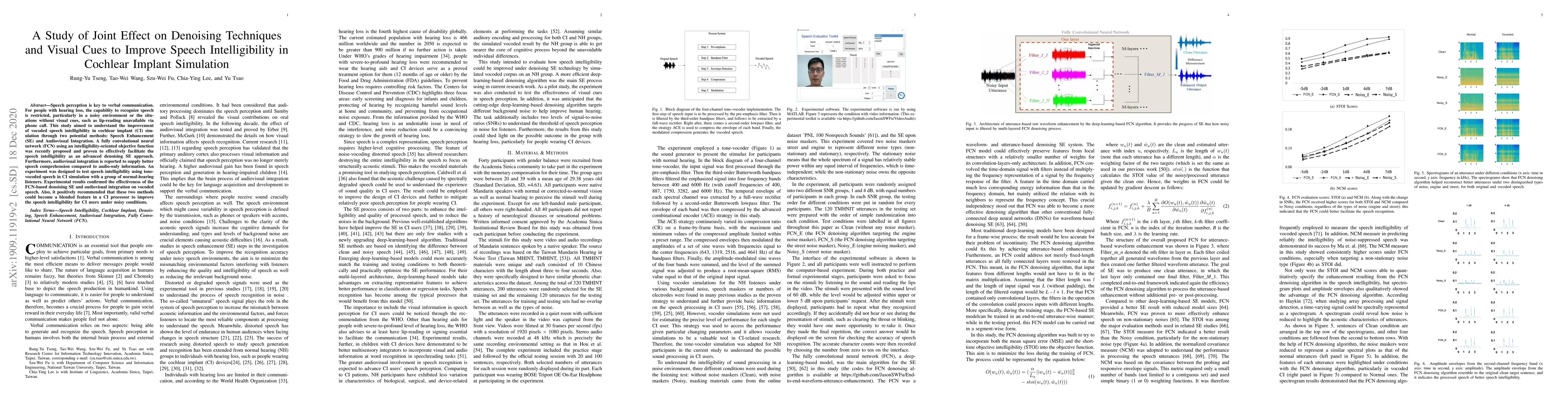 Speech perception is key to verbal communication. For people with hearing loss, the capability to recognize speech is restricted, particularly in a noisy environment or the situations without visual cues, such as lip-reading unavailable via phone call. This study aimed to understand the improvement of vocoded speech intelligibility in cochlear implant (CI) simulation through two potential methods: Speech Enhancement (SE) and Audiovisual Integration. A fully convolutional neural network (FCN) using an intelligibility-oriented objective function was recently proposed and proven to effectively facilitate the speech intelligibility as an advanced denoising SE approach. Furthermore, audiovisual integration is reported to supply better speech comprehension compared to audio-only information. An experiment was designed to test speech intelligibility using tone-vocoded speech in CI simulation with a group of normal-hearing listeners. Experimental results confirmed the effectiveness of the FCN-based denoising SE and audiovisual integration on vocoded speech. Also, it positively recommended that these two methods could become a blended feature in a CI processor to improve the speech intelligibility for CI users under noisy conditions.