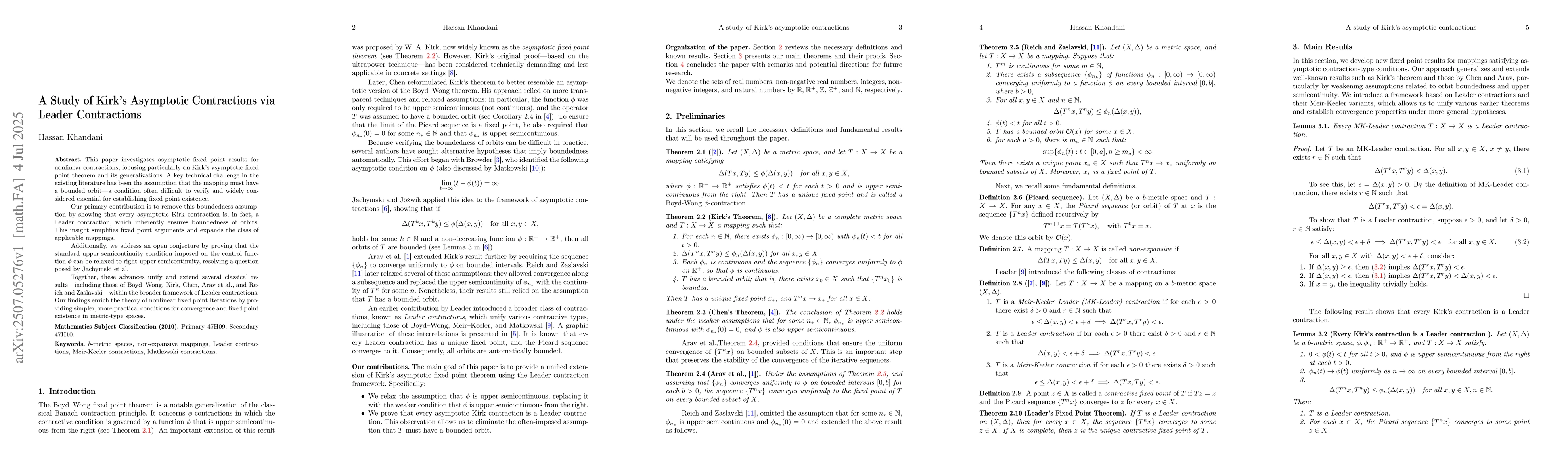 This paper investigates asymptotic fixed point results for nonlinear contractions, with emphasis on Kirk-type theorems and their generalizations. A central difficulty in the literature has been the requirement that the mapping possesses a bounded orbit, a condition that is often hard to verify and traditionally viewed as essential for guaranteeing the existence of fixed points. We eliminate this boundedness assumption by proving that every asymptotic Kirk contraction is a Leader contraction, which inherently guarantees orbit boundedness. This observation simplifies fixed point arguments and broadens the scope of applicable mappings. We also resolve an open question by showing that the standard upper semicontinuity condition on the control function phi can be weakened to right-upper semicontinuity, addressing a conjecture posed by Jachymski et al. These contributions unify and generalize several foundational results, including those of Boyd-Wong, Kirk, Chen, Arav et al., and Reich and Zaslavski, under the more flexible framework of Leader contractions. The results offer streamlined and more practical conditions for convergence and fixed point existence in generalized metric spaces.