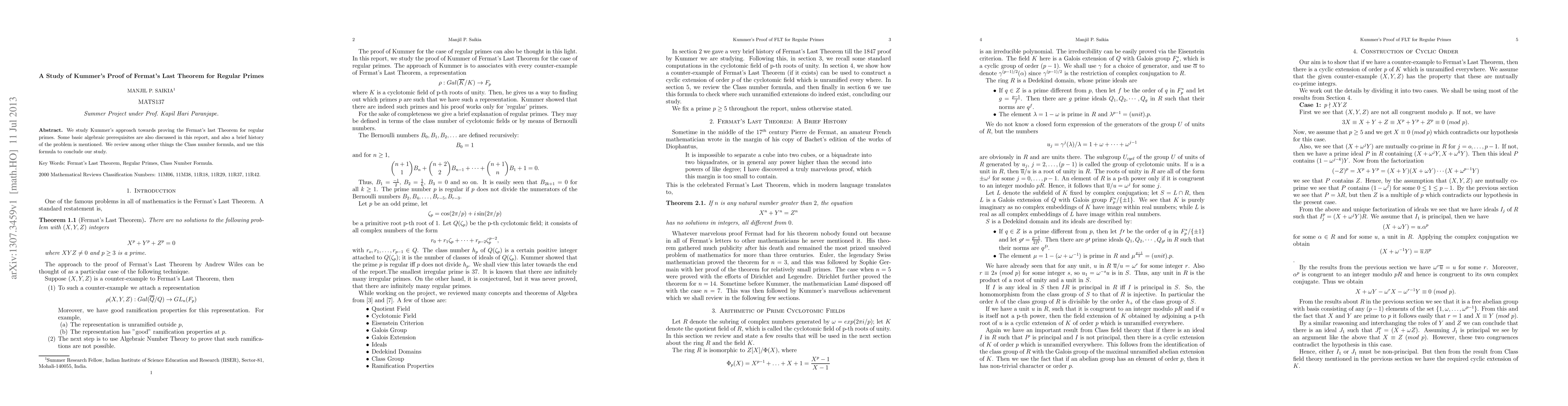 This paper examines Kummer's method for proving Fermat's Last Theorem for regular primes, including necessary algebraic foundations and a brief history of the theorem. It utilizes the Class number formula to conclude the study.