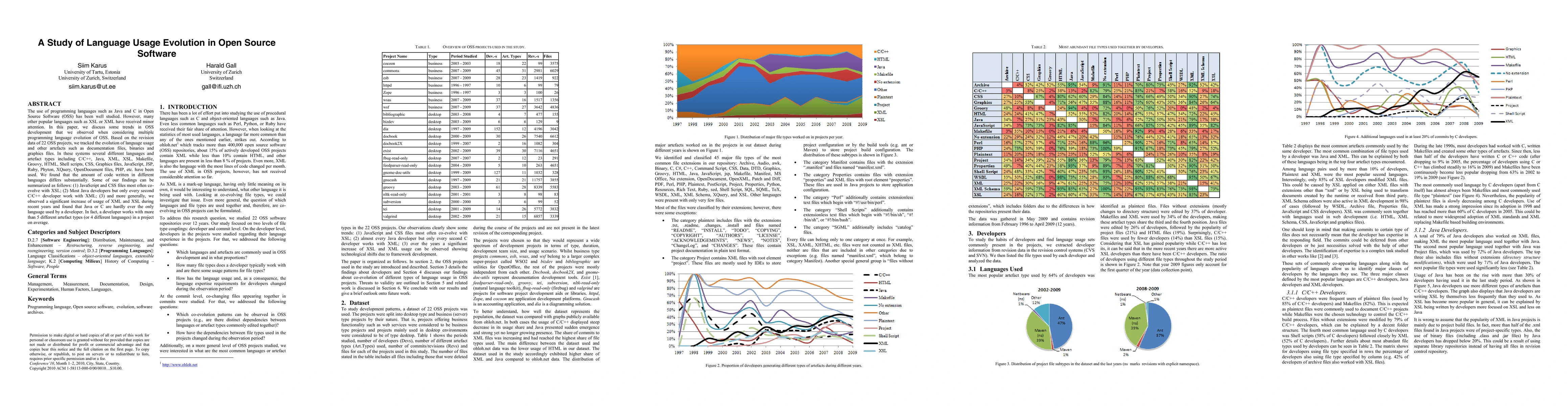 Researchers studied language usage evolution in 22 Open Source Software projects, finding that developers use multiple languages and artefacts, with a significant increase in XML and XSL usage over recent years.