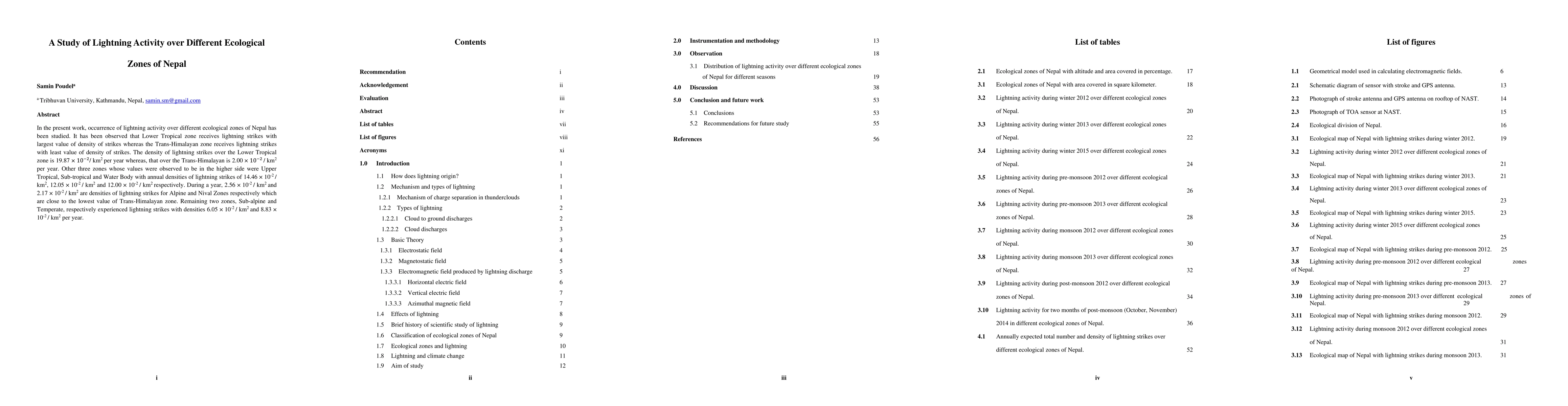 In the present work, occurrence of lightning activity over different ecological zones of Nepal has been studied. It has been observed that Lower Tropical zone receives lightning strikes with largest value of density of strikes whereas the Trans-Himalayan zone receives lightning strikes with least value of density of strikes. The density of lightning strikes over the Lower Tropical zone is 0.199 per square km per year whereas, that over the Trans-Himalayan is 0.02 per square km per year. Other three zones whose values were observed to be in the higher side were Upper Tropical, Sub-tropical and Water Body with annual densities of lightning strikes of 0.145 per square km, 0.121 per square km and 0.12 per square km respectively. During a year, 0.026 per square km and 0.022 per square km are densities of lightning strikes for Alpine and Nival Zones respectively which are close to the lowest value of Trans-Himalayan zone. Remaining two zones, Sub-alpine and Temperate, respectively experienced lightning strikes with densities 0.061 per square km and 0.088 per square km per year.