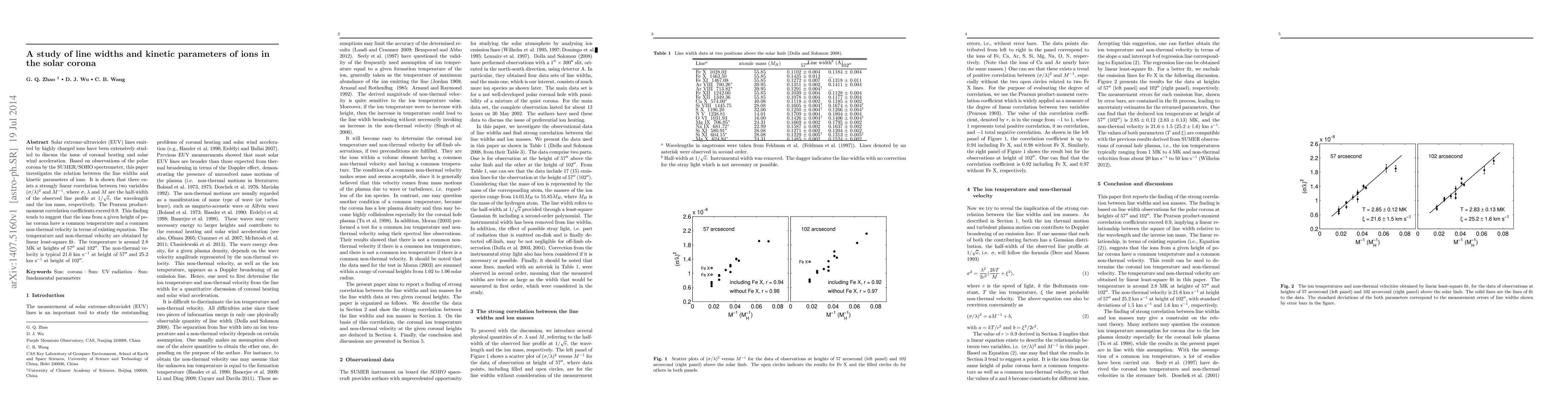 Solar extreme-ultraviolet (EUV) lines emitted by highly charged ions have been extensively studied to discuss the issue of coronal heating and solar wind acceleration. Based on observations of the polar corona by the SUMER/SOHO spectrometer, this paper investigates the relation between the line widths and kinetic parameters of ions. It is shown that there exists a strongly linear correlation between two variables $(\sigma/\lambda)^2$ and $M^{-1}$, where $\sigma$, $\lambda$ and $M$ are the half-width of the observed line profile at $1/\sqrt{e}$, the wavelength and the ion mass, respectively. The Pearson product-moment correlation coefficients exceed 0.9. This finding tends to suggest that the ions from a given height of polar corona have a common temperature and a common non-thermal velocity in terms of existing equation. The temperature and non-thermal velocity are obtained by linear least-square fit. The temperature is around $2.8$ MK at heights of 57$''$ and 102$''$. The non-thermal velocity is typical 21.6 km s$^{-1}$ at height of 57$''$ and 25.2 km s$^{-1}$ at height of 102$''$.
